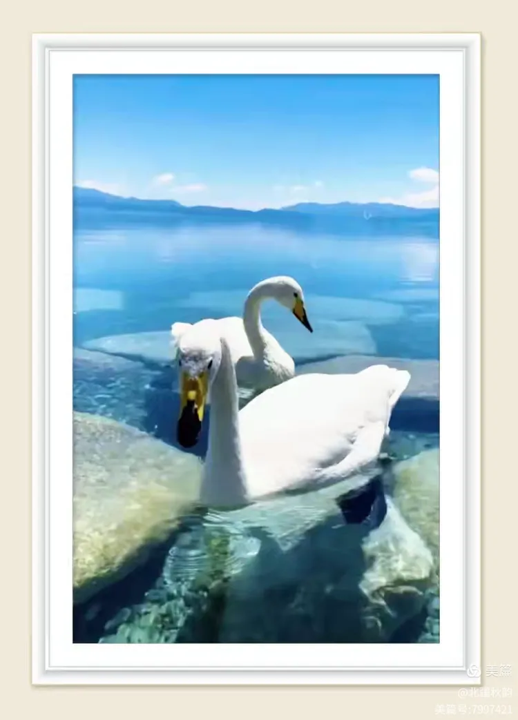于水波潋滟处,天鹅悠然泛游。或独栖凝思,或比翼相傍,似诉绵绵情长。与湖水相偎,和自然相洽,遂成天地间绝美之缀饰。
