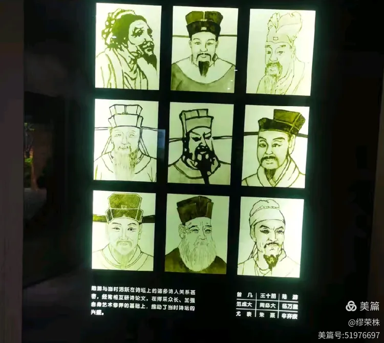 九幅古代文人的画像排列成三列三排展示在一个发光背景板上。这些文人或许也曾为陆游与唐琬的爱情故事所感动,他们的作品中或许也蕴含着对这段爱情的敬重与怀念。看着这些画像,我不禁思考,他们的才华与情感是如何穿越时空,与我们产生共鸣的。