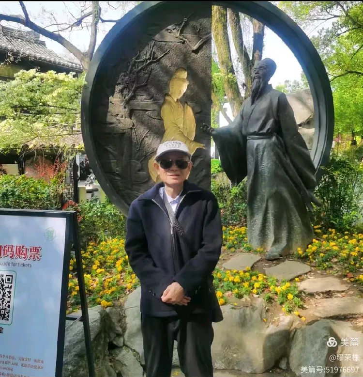 在沈园内,我还遇到了一位穿着深色外套的人,他站在一座雕像前面拍照留念。在他身后的圆形雕塑中雕刻着一个人的形象,并有一块二维码牌放在一旁供游客扫码购票进入景区参观游览。我也不禁拿出手机,记录下这美好的瞬间。