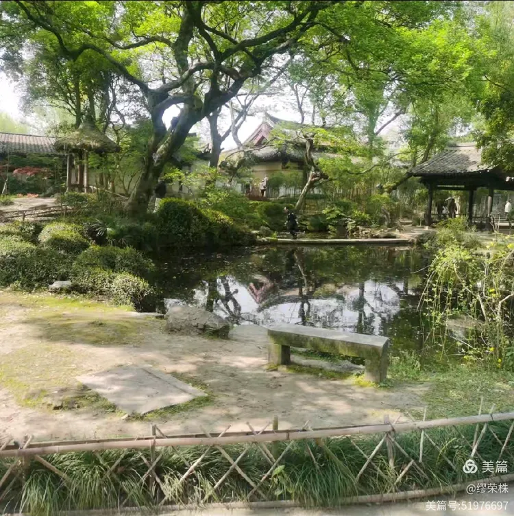 沈园的园林景色宁静而优美,绿树成荫,池塘清澈见底。周围点缀着石凳与小亭子,仿佛在诉说着往昔的故事。我坐在石凳上,闭上眼睛,耳边仿佛响起了陆游与唐琬的低语,那份深情厚谊,让人久久不能忘怀。