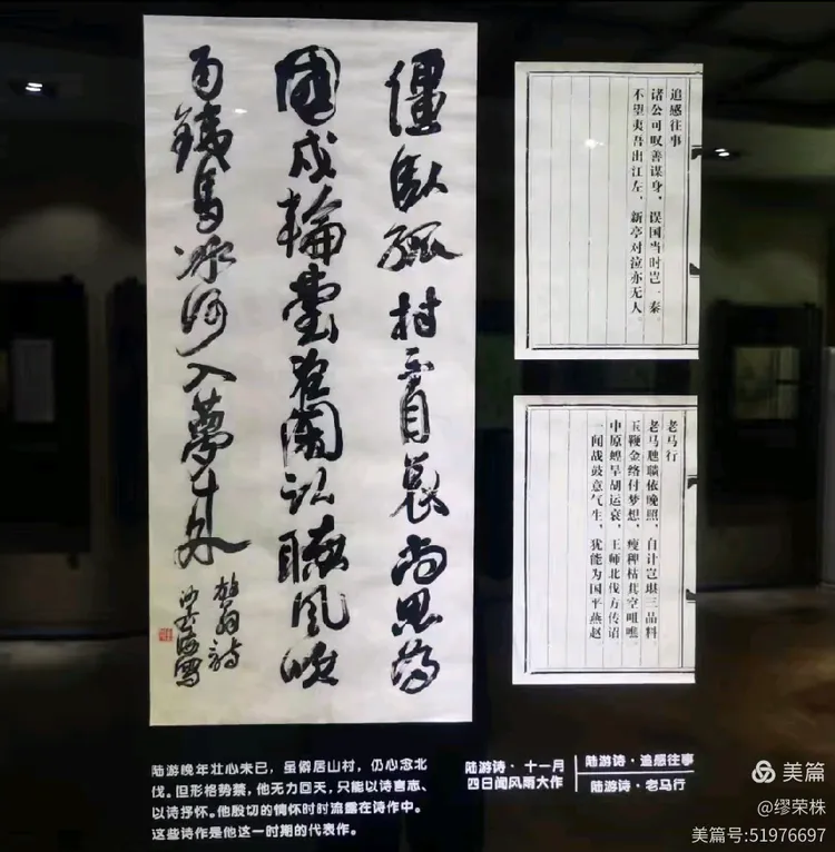 沈园内还展示了多幅书法作品,其中一幅大尺寸的作品上写满了草书文字。旁边还有两页纸上的小楷字体书写的内容被放大显示出来。这些书法作品不仅展现了古代文人的才华,更让我们感受到了他们对陆游与唐琬爱情故事的敬重与怀念。
