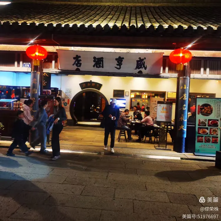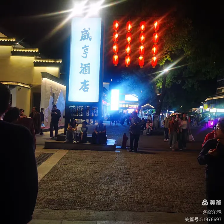 红色灯笼高挂门前,在夜色中散发着温暖的光芒,“威亨酒店”与“盛亨酒店”的招牌虽略有不同,但都承载着浓厚的文化底蕴。门口石板路延伸向远方,行人往来穿梭,店内欢声笑语不断。我站在门前,看着这热闹非凡的场景,心中感慨万千。