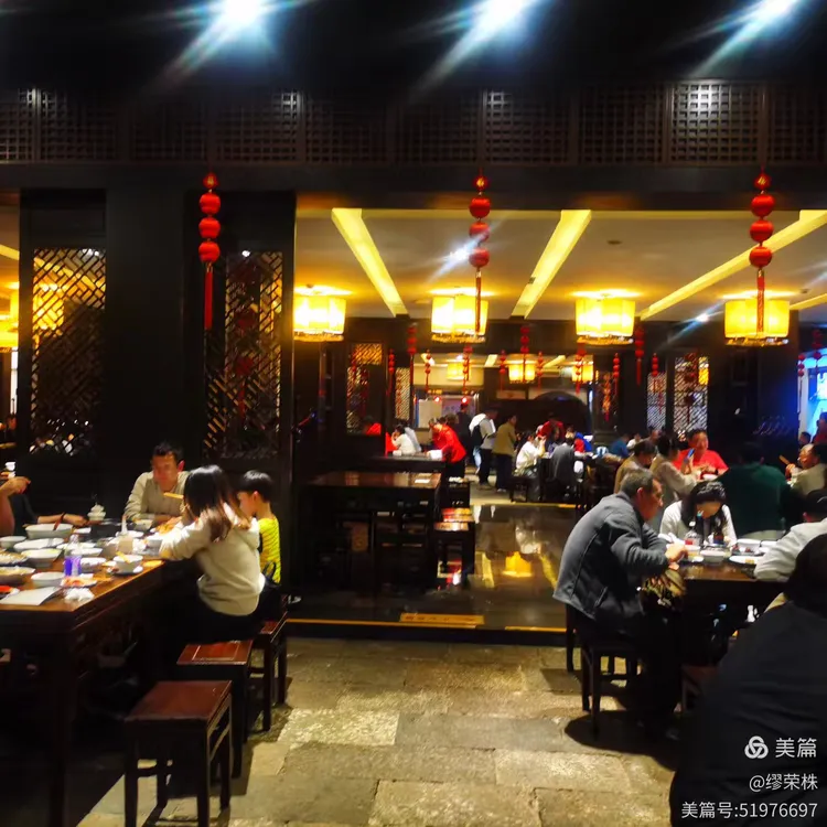 酒店内部装饰古朴典雅,天花板上的红灯笼将整个空间点缀得喜庆而温馨。整齐排列的桌椅间,人们尽情享受着美食带来的乐趣。镂空设计的墙壁和石砖地面为环境增添了几分艺术气息,让人倍感舒适惬意。