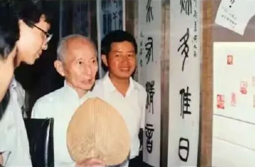 (著名古文字学家、书法家商承祚先生,1983年参观金熙长在中大举办的书法展,左一带眼镜者为金熙长)
