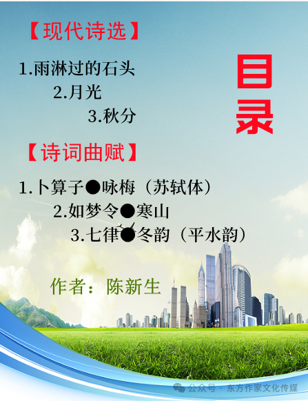 作者简介:陈新生,福建福州人。中华诗词学会会员,福建省诗词学会员,福州嵩阳诗社社长。美国纽约四海诗社基本社友。作品散见于《福建诗词》《全国诗社社友作品选》及国内诗词刊物。著有《秋风吟》《细语集》。《与清风对白》陈新生现代诗歌一百首;《且共闲云漫赋诗》古典诗词六百首。