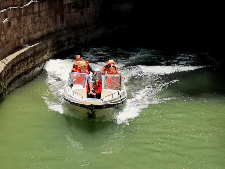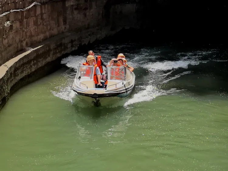乘船穿越水道时,狭窄的空间和幽暗的环境给人一种探险的感觉。水流缓缓推动小船前行,两侧石壁上布满青苔,偶尔还能看到阳光透过拱形结构洒落下来,为这段旅程增添了几分神秘色彩。