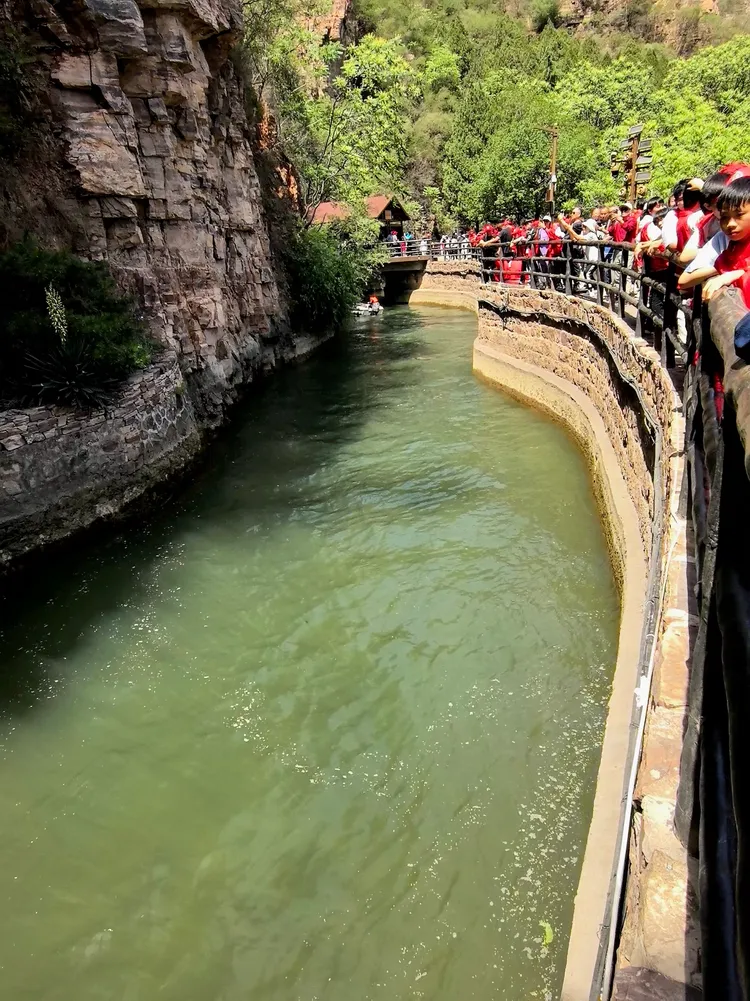 进入景区后,来到一处观景台,眼前是一条清澈的小河蜿蜒穿过山间,两岸岩石陡峭,植被茂密。木质栈道沿着河边延伸,不少游客在此漫步或驻足拍照。远处群山连绵起伏,近处流水潺潺,构成了一幅动静结合的山水画。