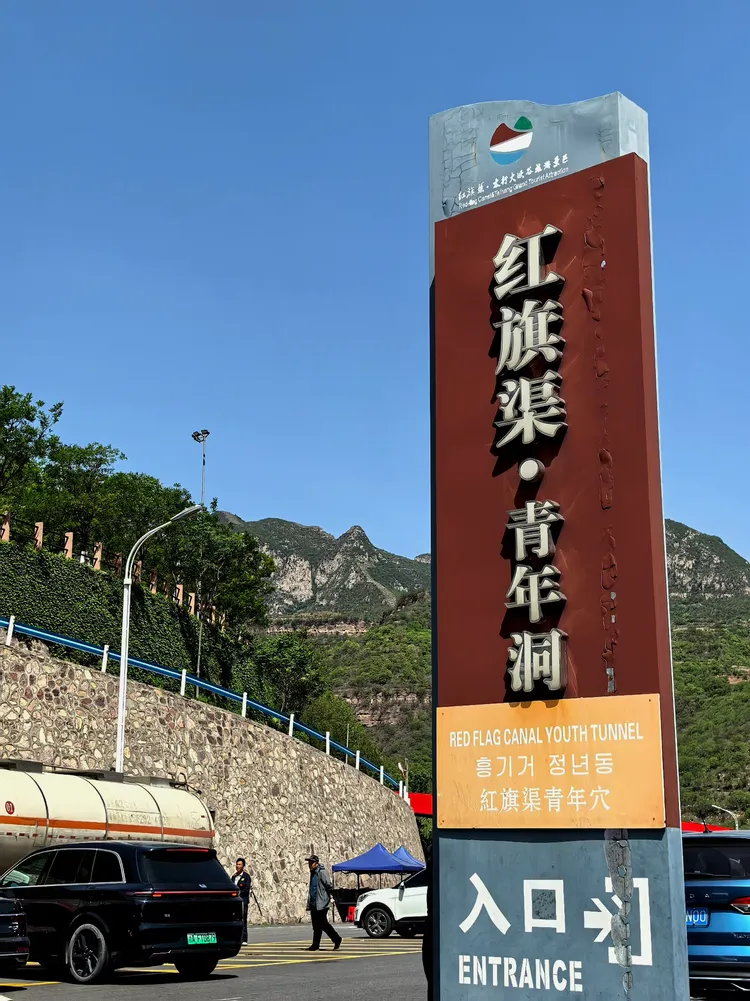 首先映入眼帘的是红旗渠景区入口,“红旗渠·青年洞”几个大字在蓝天白云下格外醒目。不远处停着几辆汽车,行人三三两两交谈着步入景区。沿着石碑指引的方向前行,沿途绿树成荫,红色建筑点缀其间,仿佛走进了一幅美丽的画卷。