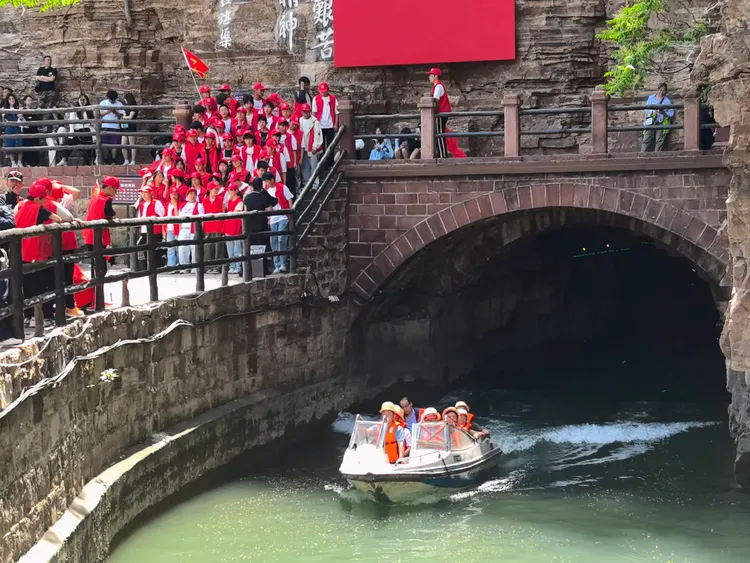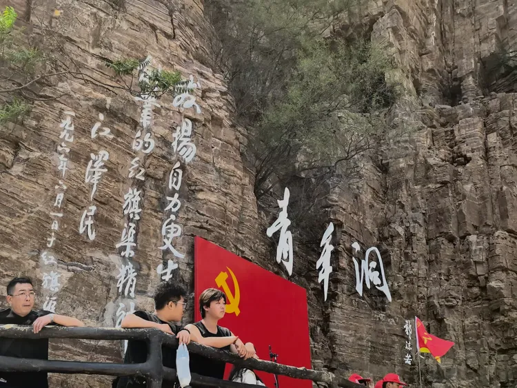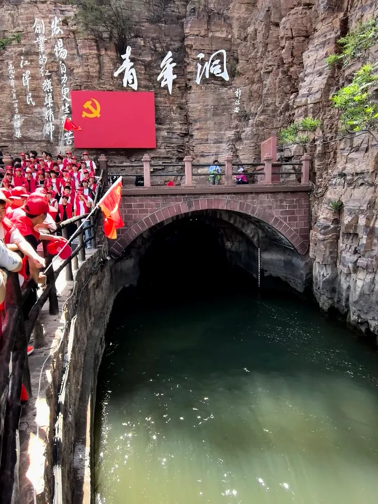 继续前行,便到了著名的青年洞。这里是红旗渠工程中最具代表性的部分之一,当年为了修建这条水渠,无数青年人挥洒汗水甚至献出生命。洞口刻有“青年洞”三个大字,旁边还挂着写有“发扬自力更生艰苦创业精神”的红色旗帜,令人肃然起敬。