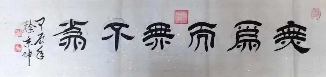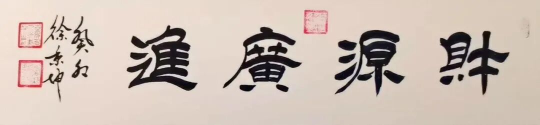 无意与书坛争名,徐秉坤先生走的,正是一条无暇于他人的从容之路。所以看他的书法作品,是完全去除了浮躁,反而倒是颇有一种胸中餍饫,腕下精熟的养正境界,可以令人深感书道正宗!字字隶法,汉隶为基,但不同于临摹不变的复刻匠作,徐秉坤先生笔下的隶书则是更多了一丝巧妙多端。正如明代项穆所言,书法要旨,有正与奇。所谓正者,偃仰顿挫,揭按照应,筋骨威仪,确有节制是也。所谓奇者,参差起复,腾凌射空,风情姿态是也。今徐秉坤先生深谙此道,故其隶书常是能在形方势纵中彰显高古意韵。即在师取《张迁碑》、《曹全碑》等古典碑法精髓的基础上,他又有意识地融入了篆法的笔意,使字形略呈纵势,最终在不徐不疾中,将“篆尚婉而通”与“隶欲精而密”的古字要义巧妙融合,使隶书尽显出一派自家气象,沉实势遒,神采外曜!