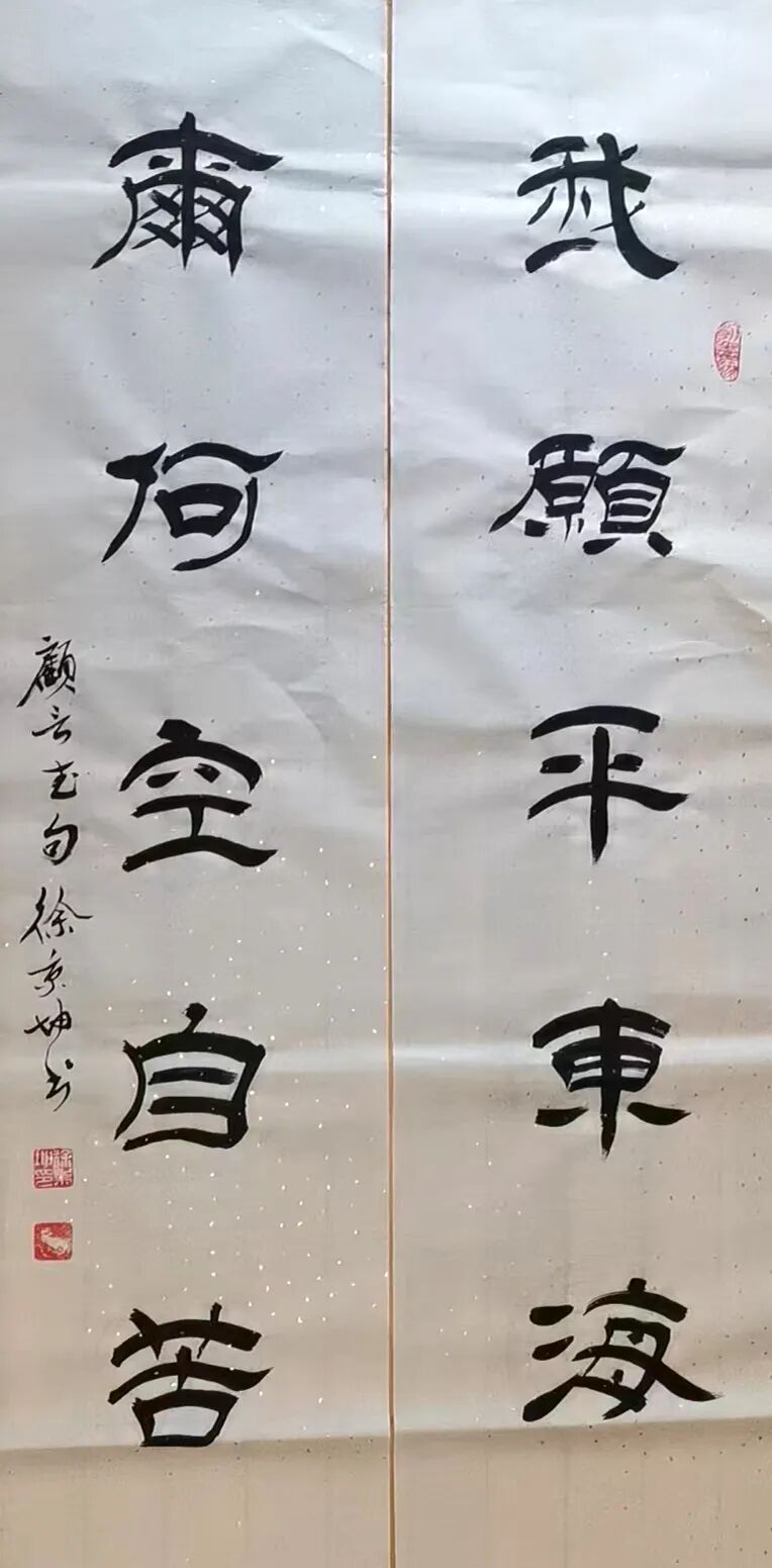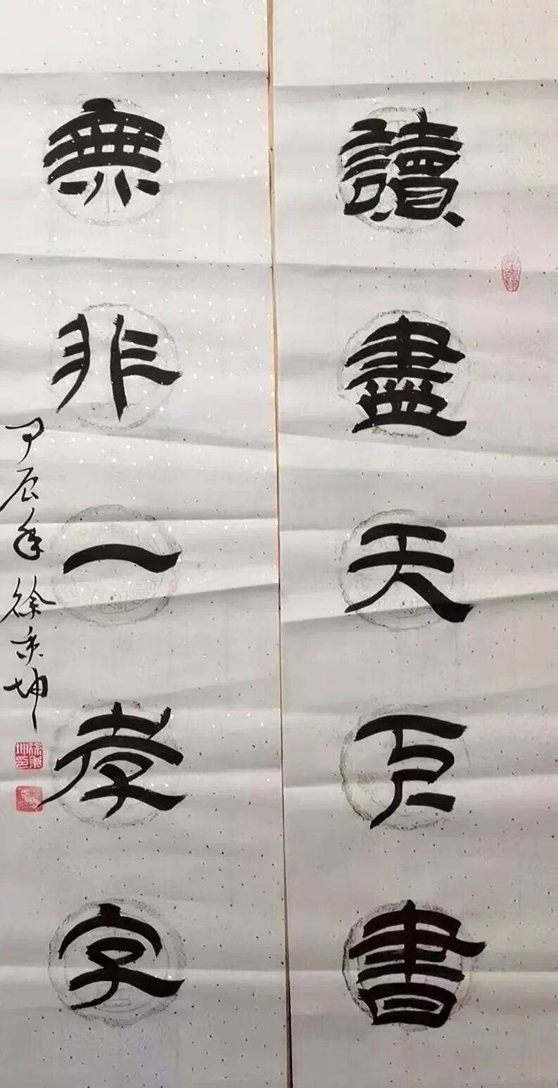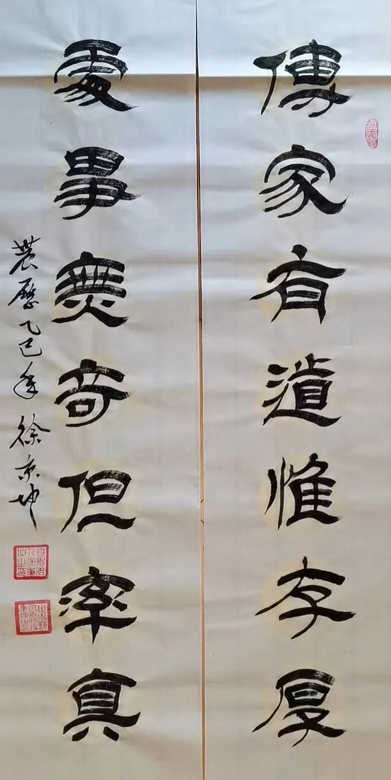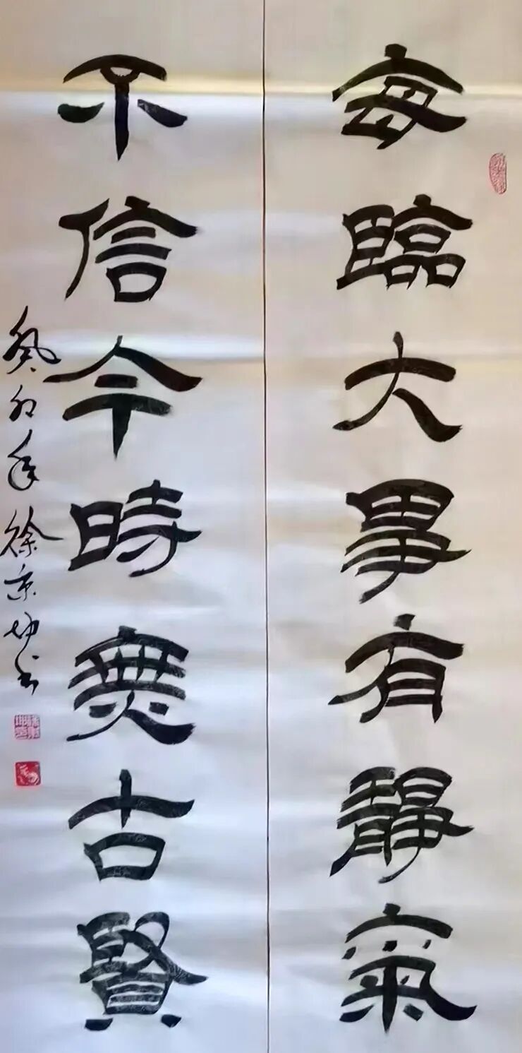胸有成书,神气朴散。欣赏徐秉坤先生的书法,犹如品味一瓶陈年泥壶老酒,书香馥郁,醇厚朴实,没有丝毫的萎靡甜俗,更无半点的佻巧刻板。笔毫所到处,皆可谓是规矩入巧,乃明神化!因此众幅隶书,无一不是端雅庄重,章法严明,如此方劲古拙之势,宛如大臣冠剑,俨立于廊庙之上。其志于此书,徘徊于今古,而遍观时下取法乎上者,能及先生此番境界之人,实不多矣!所谓品高,当之无愧!