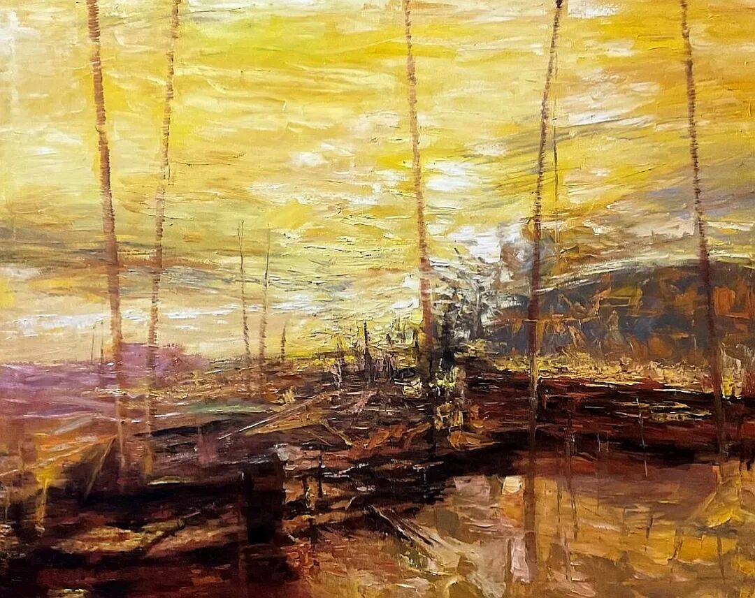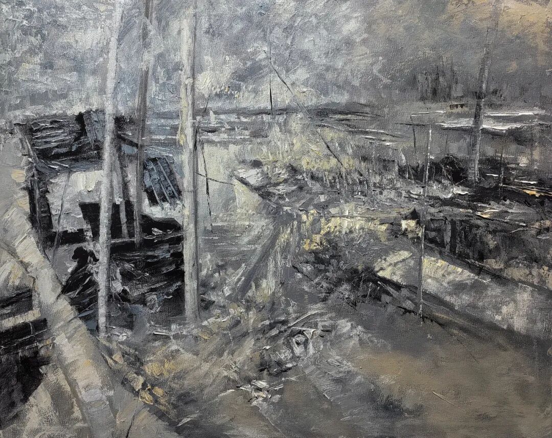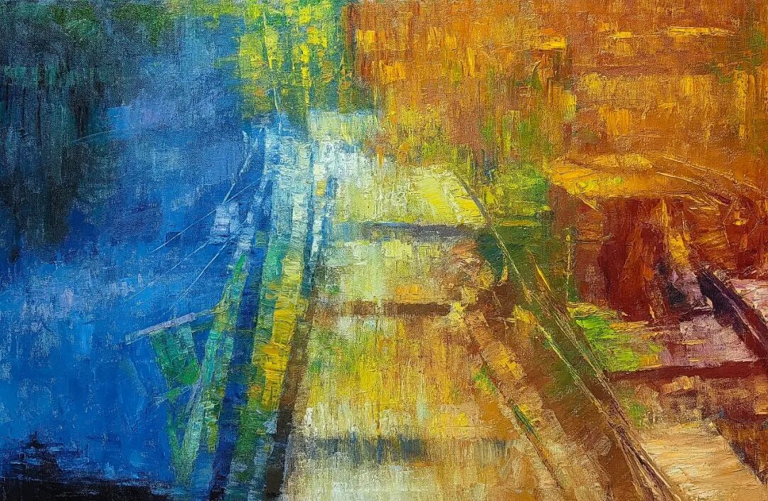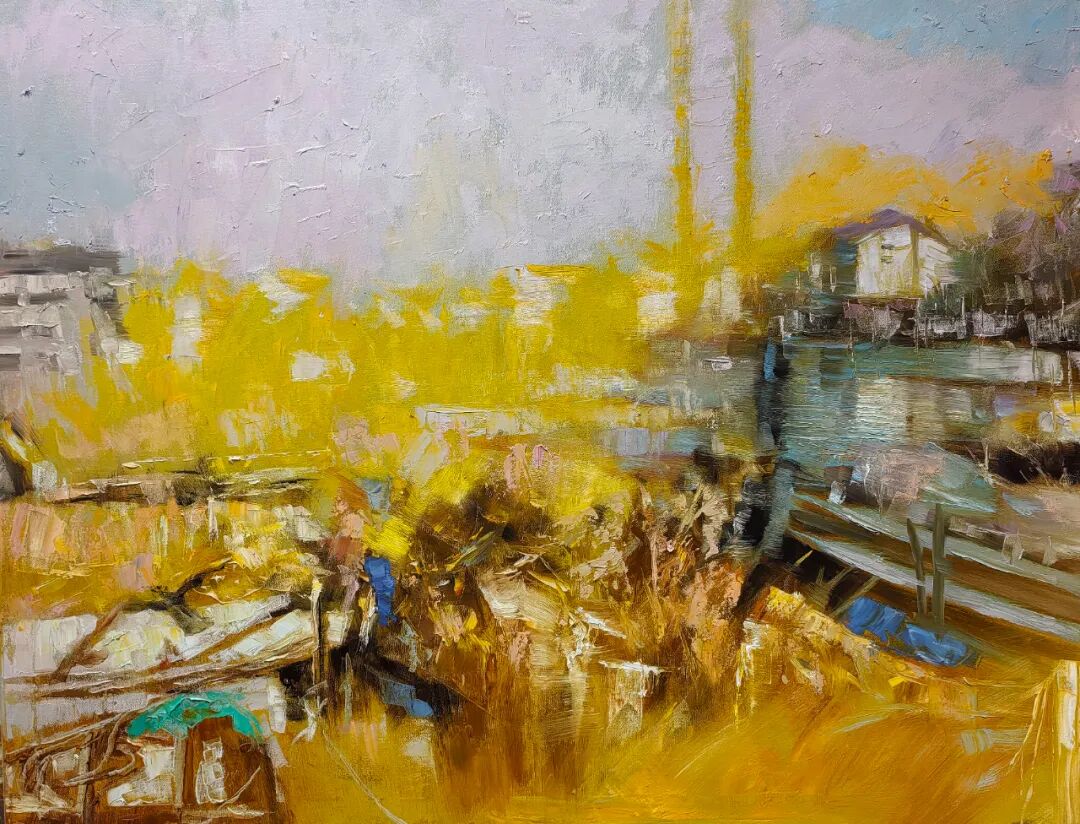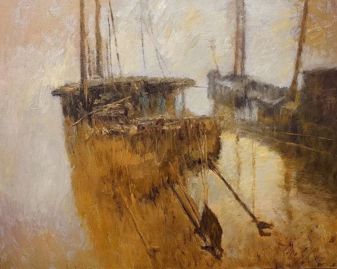 欣赏洪斌先生的油画作品,不难发现他是蕴含了丰富的情感层次,画面时而流露文人式的浪漫哲思,时而又定格在了现实主义的深沉瞬间。并且无论题材如何变化,他也总能以精准而锋利的笔触,剖开表象,直抵本质。亦或者说,他的画布就像是一面镜子,可以映照出对时代的深刻观察与思考。例如他的渔港系列作品——斑驳的光影交织出记忆的碎片,静谧的码头场景则被赋予了一种诗性的“回味感”,丰富的视觉语言在光色中形成,每一处肌理也都是承载着情感的温度,而不再是简单的色彩堆砌。因此在我看来,洪斌先生是真正彰显出了一位时代艺术家所应有的文化自觉与思想底蕴。