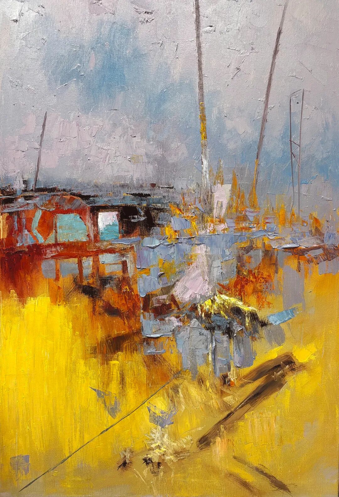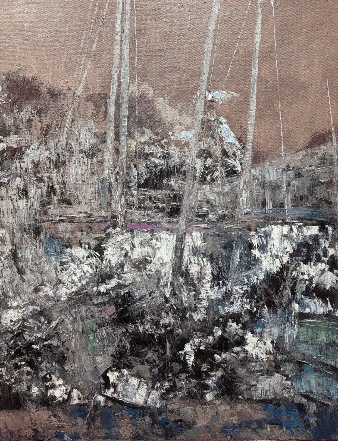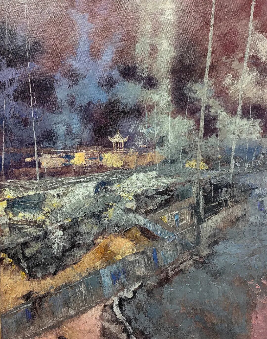 欣赏洪斌先生的油画作品,不难发现他是蕴含了丰富的情感层次,画面时而流露文人式的浪漫哲思,时而又定格在了现实主义的深沉瞬间。并且无论题材如何变化,他也总能以精准而锋利的笔触,剖开表象,直抵本质。亦或者说,他的画布就像是一面镜子,可以映照出对时代的深刻观察与思考。例如他的渔港系列作品——斑驳的光影交织出记忆的碎片,静谧的码头场景则被赋予了一种诗性的“回味感”,丰富的视觉语言在光色中形成,每一处肌理也都是承载着情感的温度,而不再是简单的色彩堆砌。因此在我看来,洪斌先生是真正彰显出了一位时代艺术家所应有的文化自觉与思想底蕴。