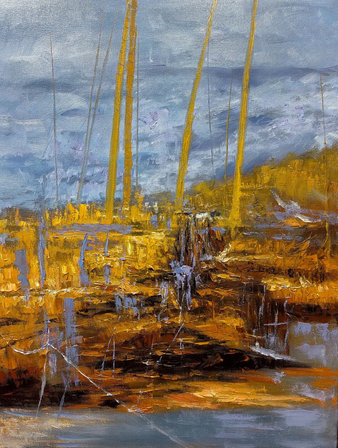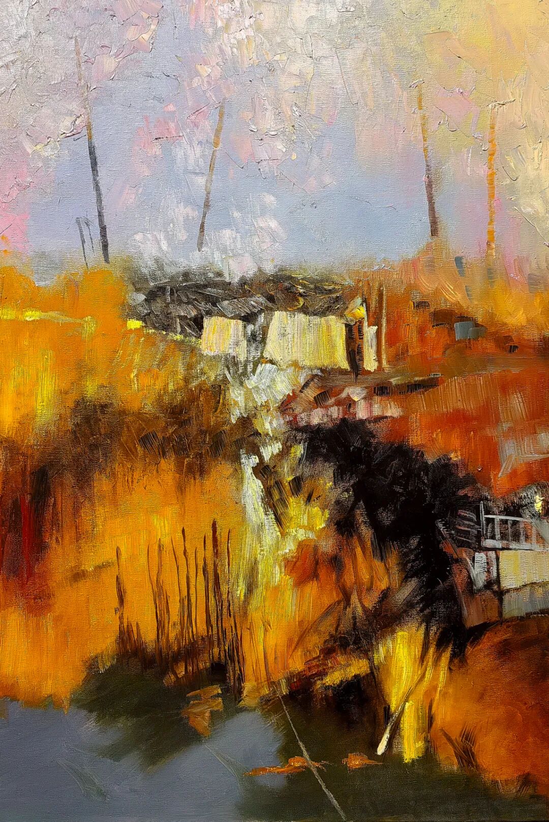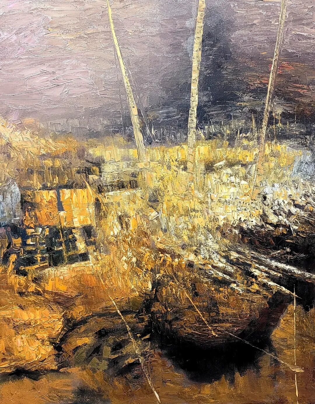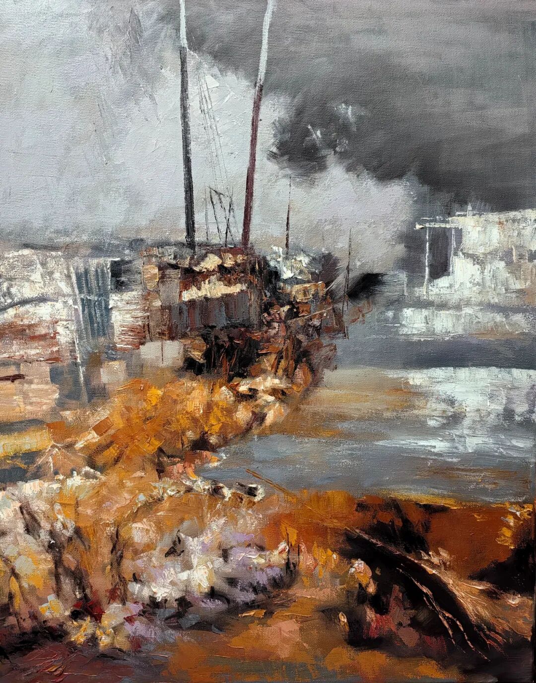 欣赏洪斌先生的油画作品,不难发现他是蕴含了丰富的情感层次,画面时而流露文人式的浪漫哲思,时而又定格在了现实主义的深沉瞬间。并且无论题材如何变化,他也总能以精准而锋利的笔触,剖开表象,直抵本质。亦或者说,他的画布就像是一面镜子,可以映照出对时代的深刻观察与思考。例如他的渔港系列作品——斑驳的光影交织出记忆的碎片,静谧的码头场景则被赋予了一种诗性的“回味感”,丰富的视觉语言在光色中形成,每一处肌理也都是承载着情感的温度,而不再是简单的色彩堆砌。因此在我看来,洪斌先生是真正彰显出了一位时代艺术家所应有的文化自觉与思想底蕴。