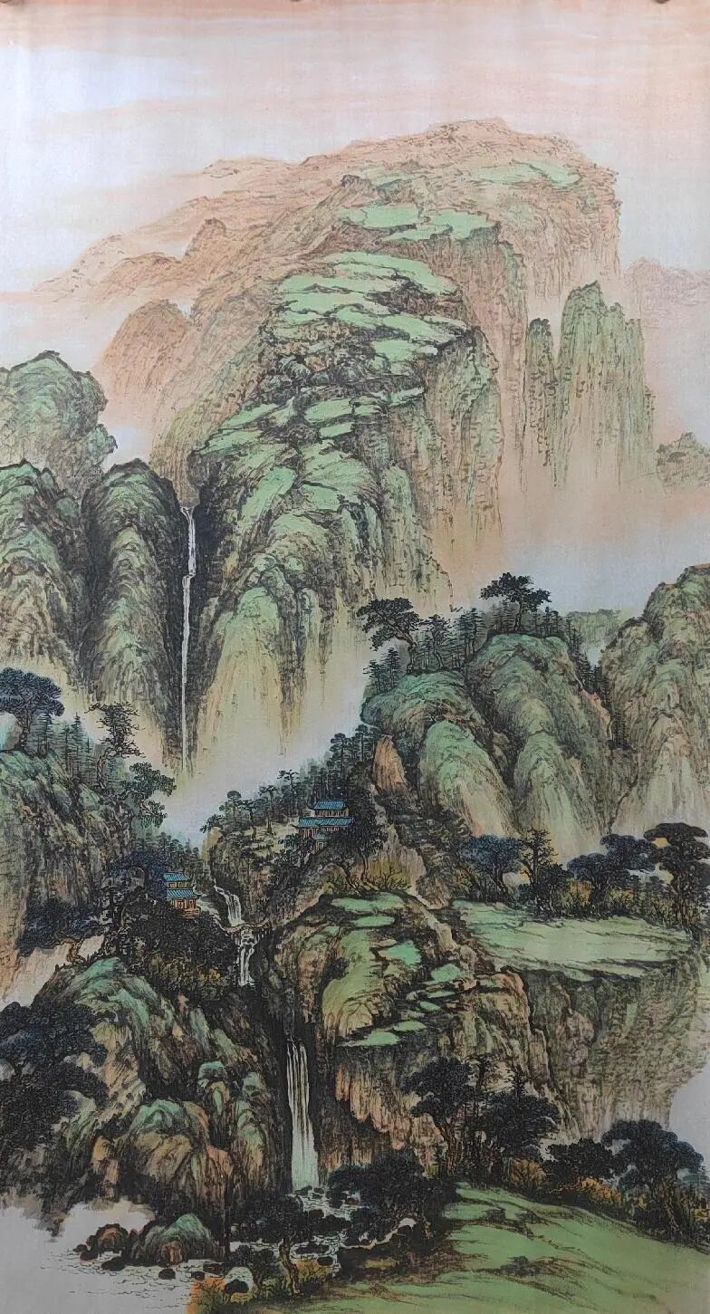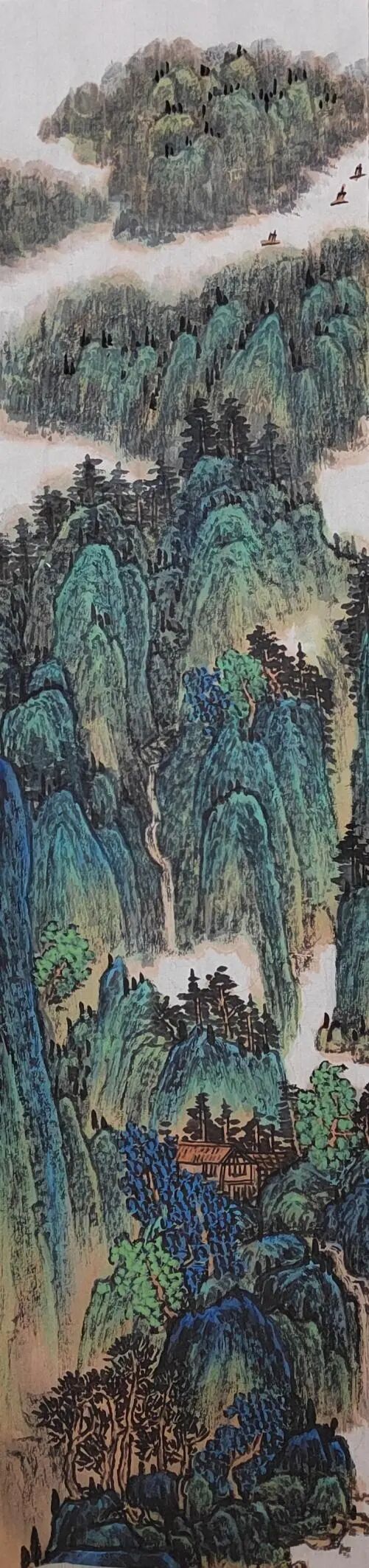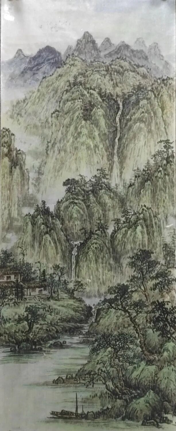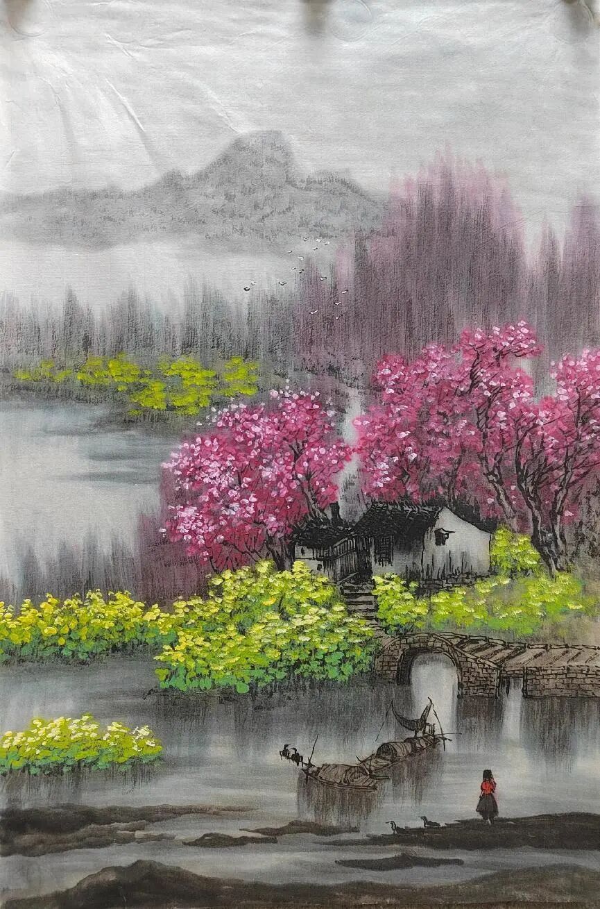 不满足于单纯模仿,她将现代审美与彩墨技法融入创作,形成 “古意今情” 的独特风格。其彩墨山水画中,淡墨与色彩相互映衬,既保留水墨韵味,又具时代气息。如描绘江南水乡时,花青染水、朱砂点灯,传递生活感悟与自然敬畏,这种传统与现代的融合,极大提升了作品艺术价值,也契合当下艺术市场对创新作品的需求。