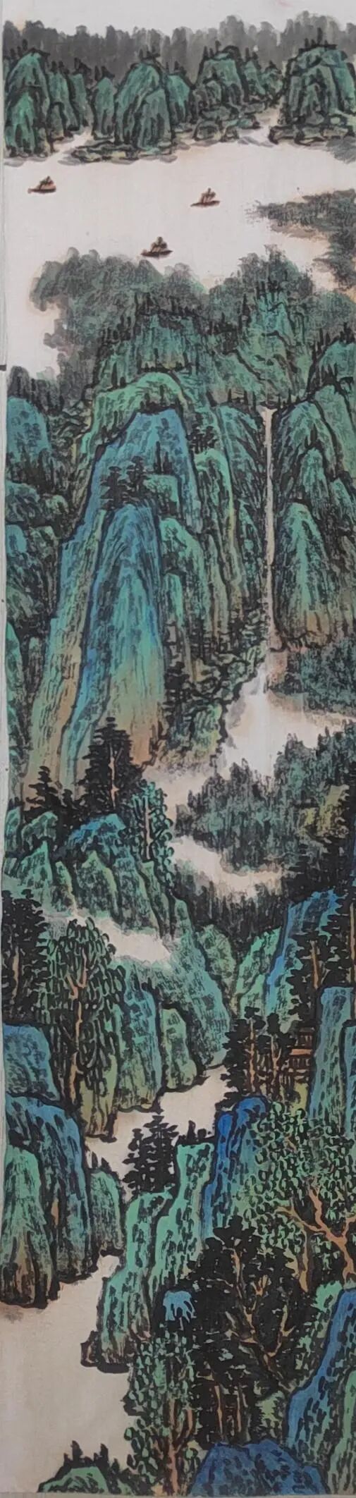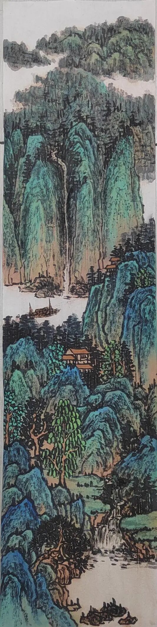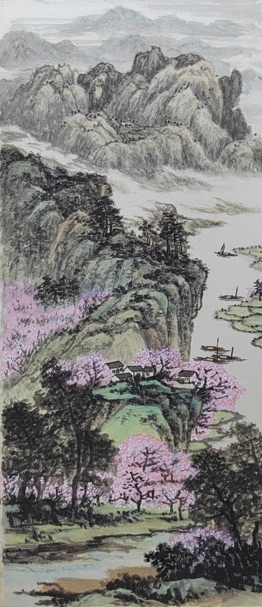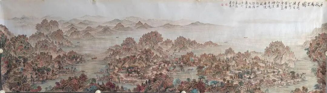 不满足于单纯模仿,她将现代审美与彩墨技法融入创作,形成 “古意今情” 的独特风格。其彩墨山水画中,淡墨与色彩相互映衬,既保留水墨韵味,又具时代气息。如描绘江南水乡时,花青染水、朱砂点灯,传递生活感悟与自然敬畏,这种传统与现代的融合,极大提升了作品艺术价值,也契合当下艺术市场对创新作品的需求。