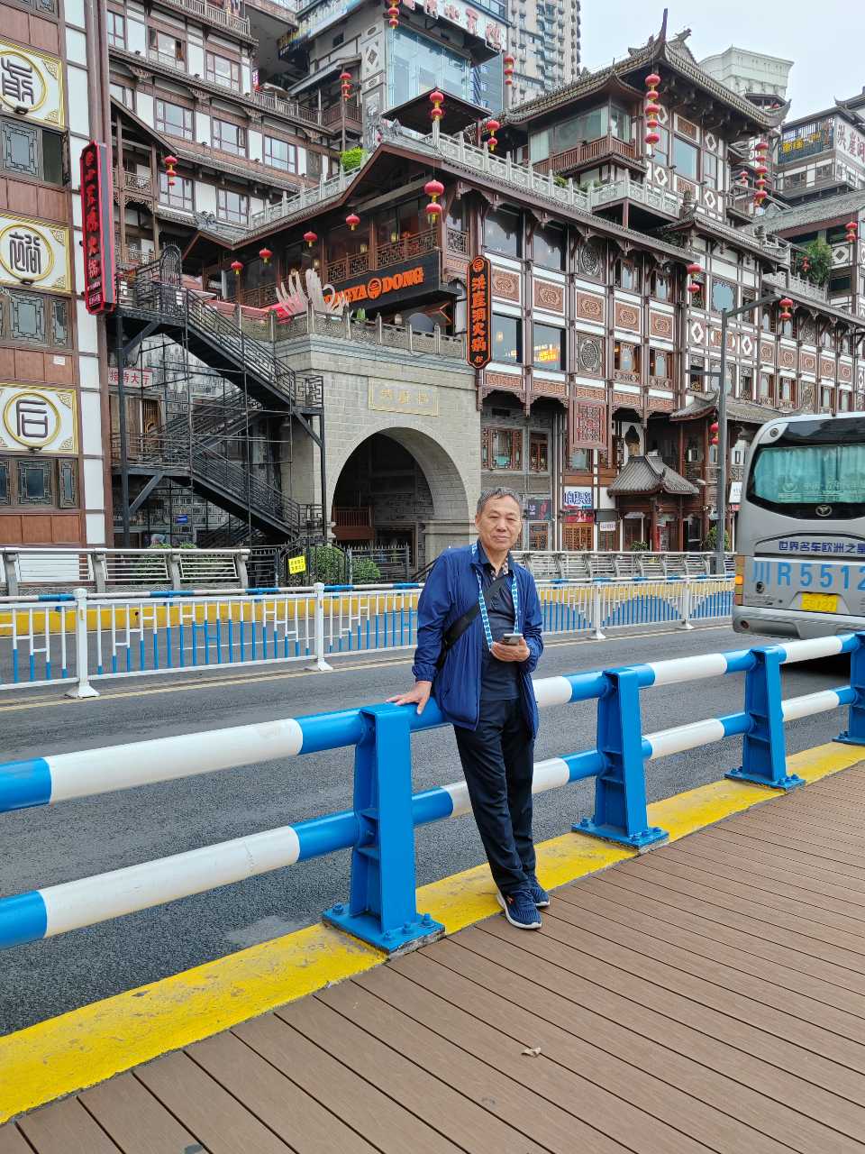 下了游船,我们漫步在长江与嘉陵江交汇的江畔赏景游玩。洪崖洞如同一颗璀璨的明珠映入眼帘。那吊脚楼依山而建,层层叠叠,错落有致,宛如一座从童话世界走来的梦幻城堡。它的倒影清晰地映在江面上,随着水波的荡漾,摇曳生姿,如梦似幻,仿佛一幅流动的水彩画,让人不禁感叹这巧夺天工的建筑之美。