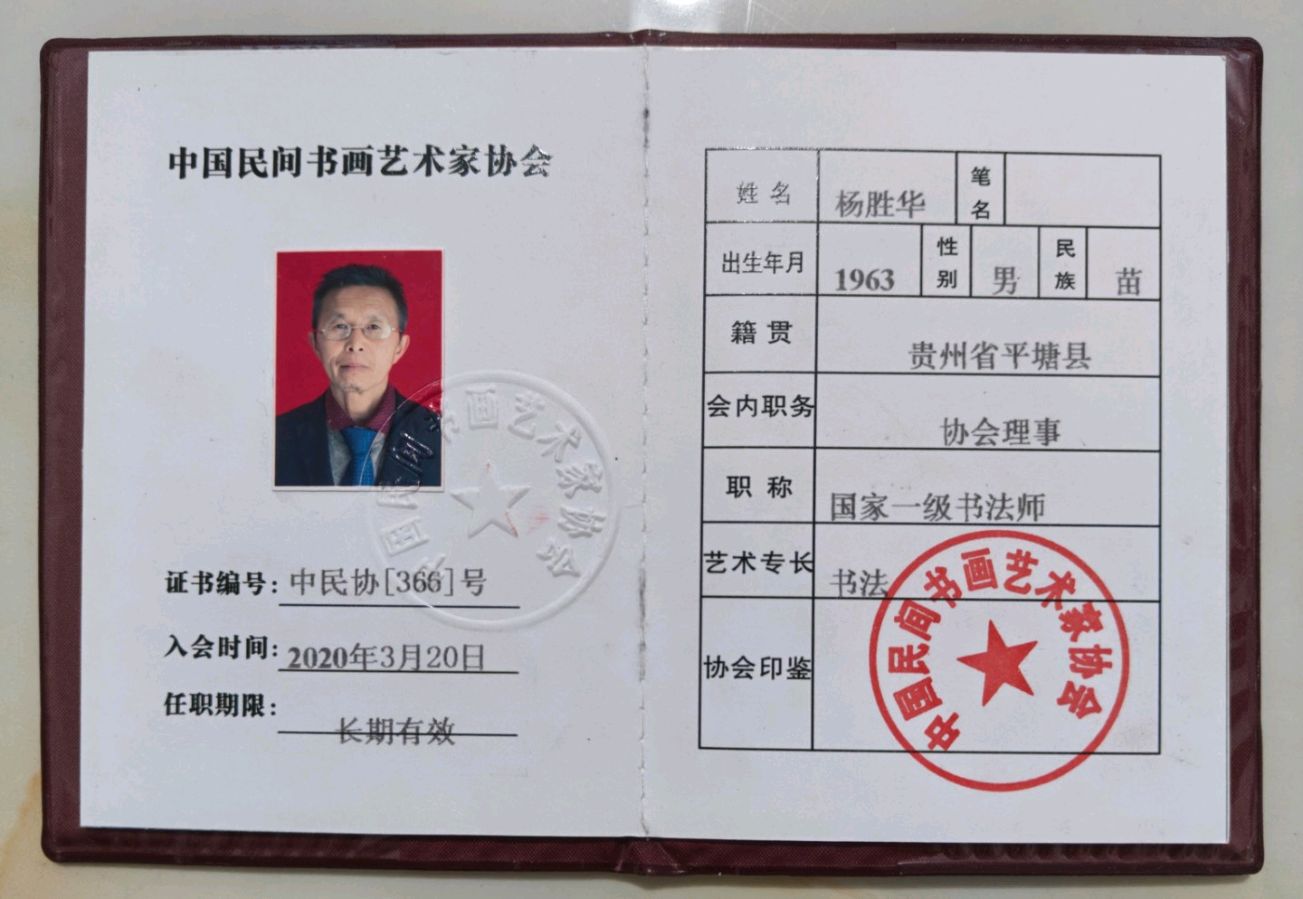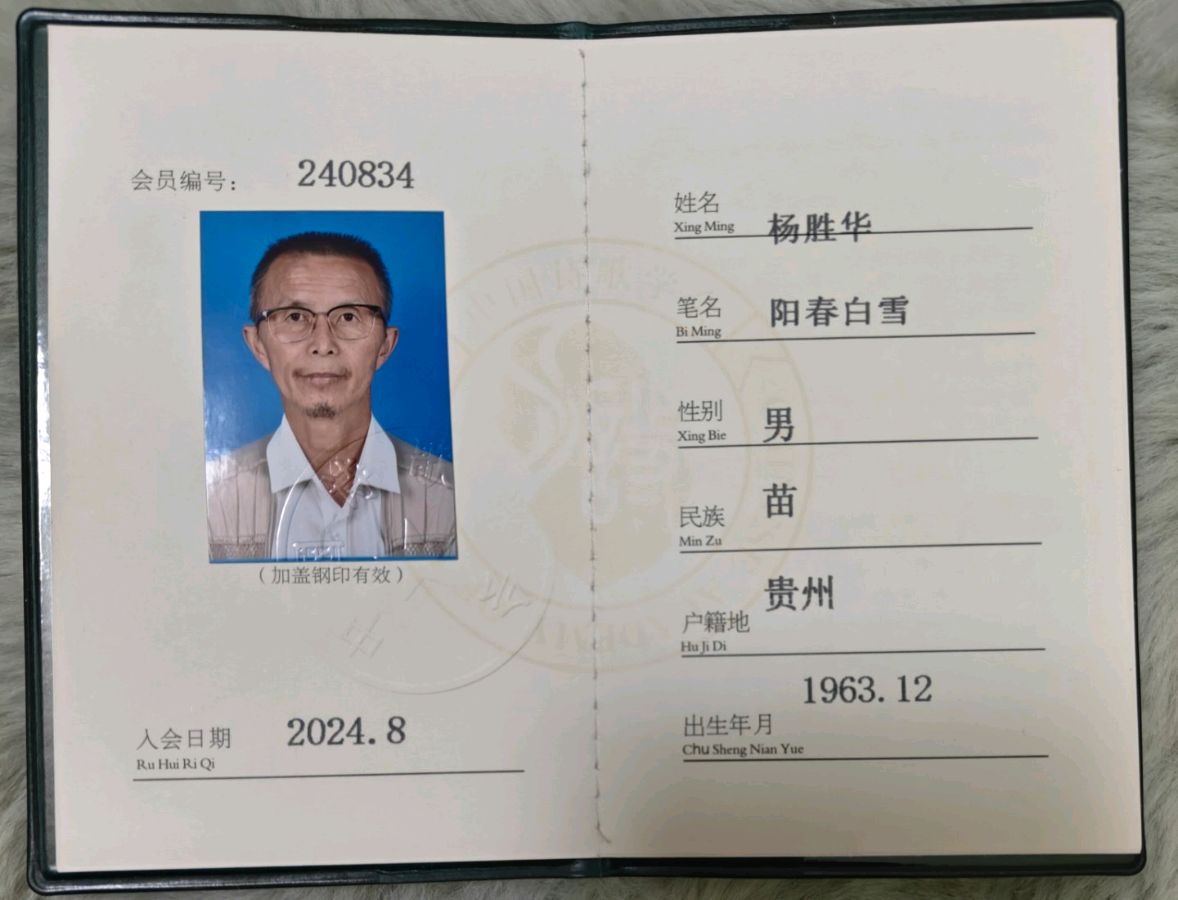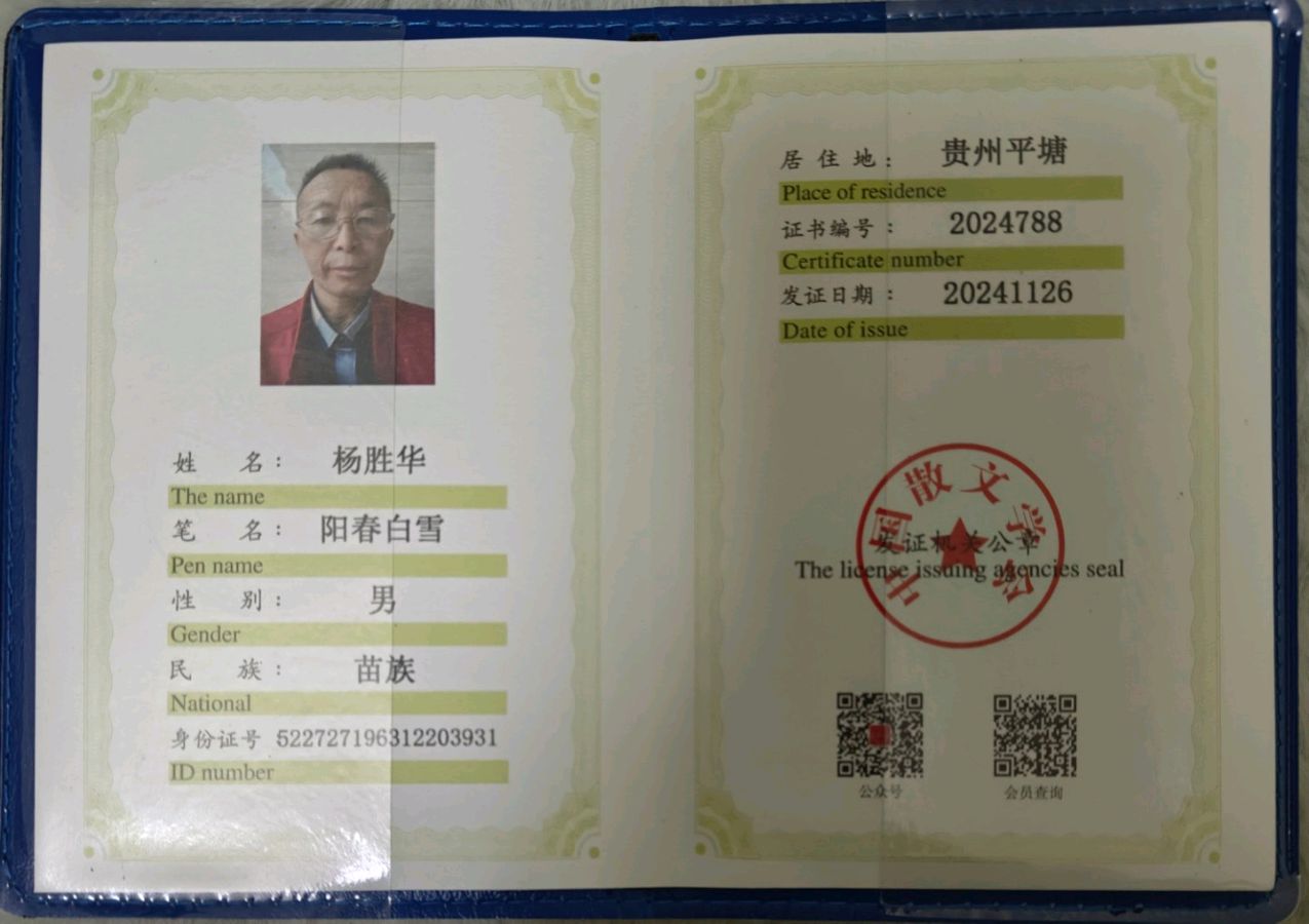 杨胜华,网名叫阳春白雪,雅名天眼居士,苗族,贵州平塘人,生于上世纪六十年代初期,中共党员,退休教师,国家一级书法师,近年参加全国书法大赛获奖20多次,其中铜奖2次银奖2次,一等奖4次,金奖6次。书法高手如云,杨老头还须努力。原系中国楹联学会会员,现系中国诗歌学会会员,中国散文学会会员,中国民间书画艺术家协会会员,中国新时代诗人档案库认证诗人,中国乡村杂志和宁古塔作家杂志签约作家,都市头条认证编辑,贵州省黔南州作家协会、都匀市作家协会和平塘县作家协会会员。曾在各大文学网站发表作品一千多篇(首),出版有个人诗歌专集《野草》和《高山流水》,个人散文集《生于天文小镇》敬请关注。