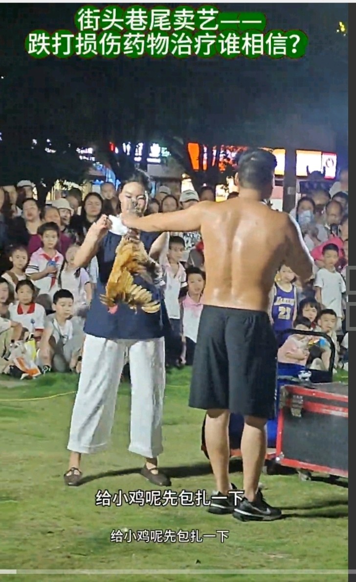 男青年表演完毕,他又拿来一只小公鸡,绕了一圈后将小公鸡的脚弄断了才放在地里,随后告诉观众朋友们:我的跌打损伤药物用来治疗这只受伤的小公鸡,大家注意,我放按摩药三五分钟后鸡可以好好地站起,你们相信不相信?现在大家注意看我大桶这里,这里装的不是水,而是跌倒损伤的药水,这桶里有灵芝菌,还有许多高贵的植物草本,用五十三度的白酒泡制而成,如果哪位需要擦试的老人,可前来试试几小滴这属于免费。