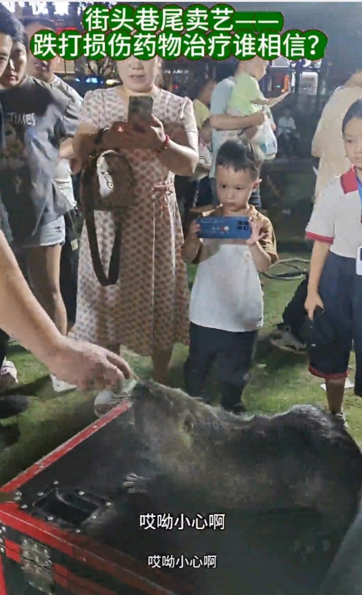 卖艺的男青年面对各位观众朋友们:我今天卖的跌打损伤药物效果好不好呢?我不用喊一两百元钱高价卖给你们,现在你买一瓶我免费送一瓶,行不行?花上五十元钱买不了上当受骗也买不了伤心,我也不会用狗皮膏药来愚弄各位朋友们。喂!喂!喂!要来买的抓紧时间了不要在久等,行不行?各位爷爷奶奶们,大哥大姐们!