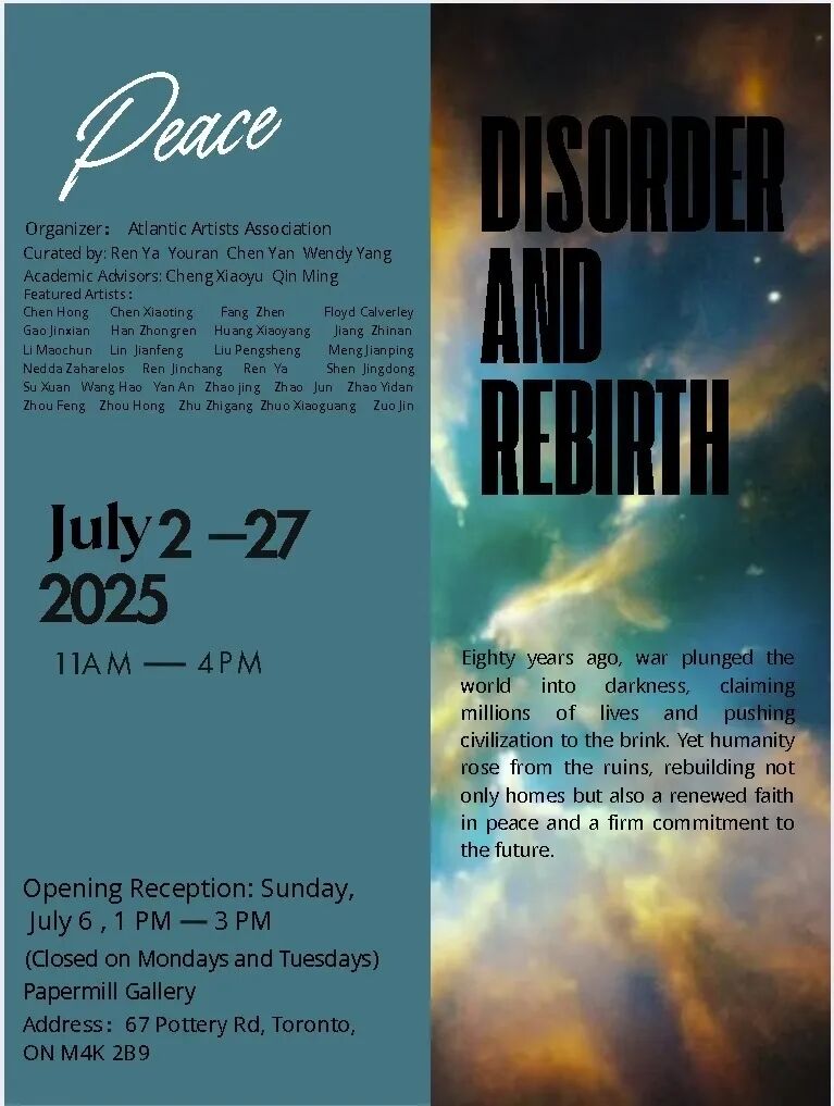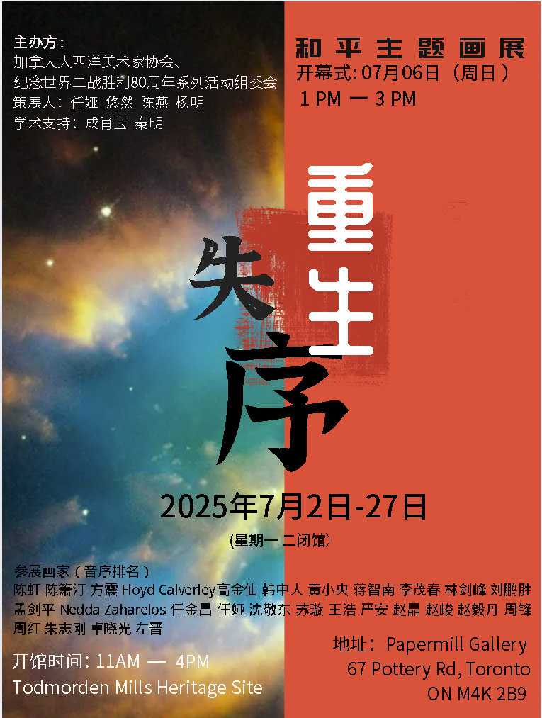 由世界反法西斯暨中国抗战胜利80周年系列活动组委会、大西洋文化艺术交流协会及大西洋美术家协会联合主办的“和平”主题国际画展《失序 & 重生》,于2025年7月6日在加拿大多伦多Todmorden Mills Heritage Site, Papermill Gallery隆重开幕。