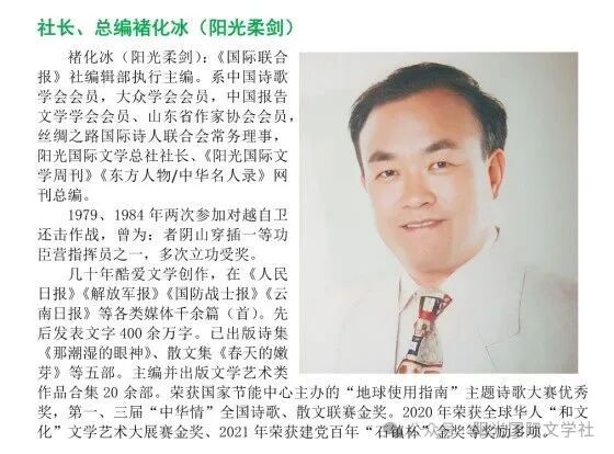 褚化冰(阳光柔剑):《国际联合报》执行主编。系中国诗歌学会、大众学会、中国报告文学学会、山东省作家协会会员,丝绸之路国际诗人联合会常务理事,中华散文网创委会副主席,阳光国际文学总社社长、网刊总编。出版《那潮湿的眼神》、《春天的嫩芽》等文集五部。主编并出版文学合集20余部。荣获国家节能中心主办的“地球使用指南”主题诗歌大赛优秀奖,第一、三届“中华情”全国诗歌、散文联赛金奖。2020年荣获全球华人“和文化”文学艺术大展赛金奖、2021年荣获建党百年“石镇杯”金奖等奖励多项。