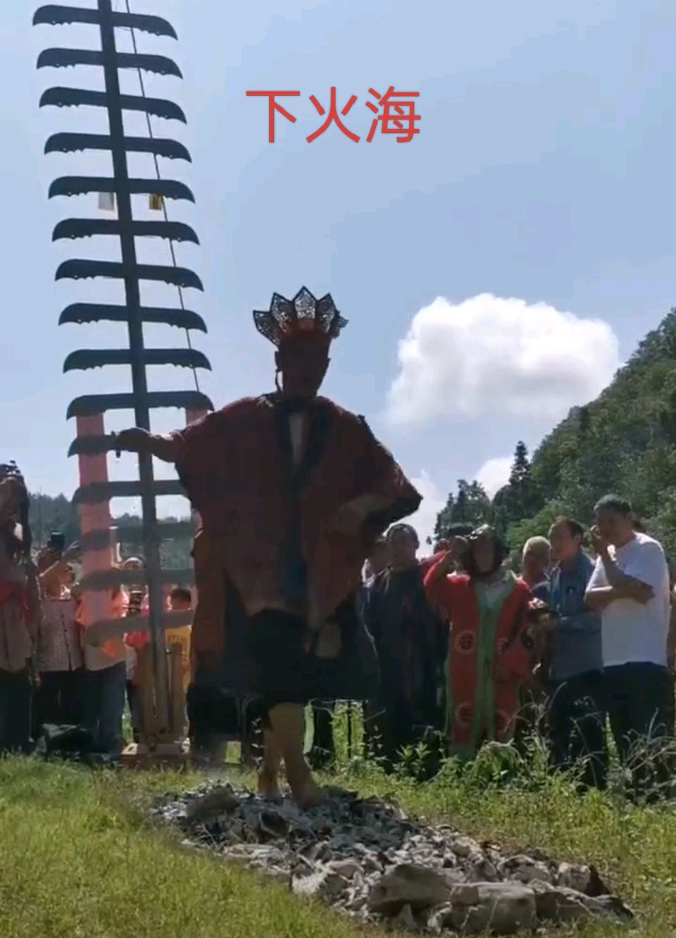 中午十二点,上刀山下火海表演在一阵敲锣打鼓声中正式上演。只见秦大师走到上刀山表演台的一张大桌面前,把鞋子一脱留下两只光脚板,在一阵牛角号的响声中把双手靠拢在大刀旁边,用双手把一匹粗布往刀口上一拉就成了两片。这个说明什么呢?说明刀口锋利谁不相信就看看。那帮傩戏人员唱着什么呢?大概意思有几点:无论你遇到了挫折和困难,不要灰心丧气不前,要保持乐观,上刀山下火海都不怕一点,还怕什么病魔缠身不断?还怕什么妖魔鬼怪吓人一番?我们是大型绝技表演者,你看看,只有你心中意志坚,大步迈上前,只要勇敢一点,面对生活的艰难,敢于挑战困难,相信就会有美好的明天。