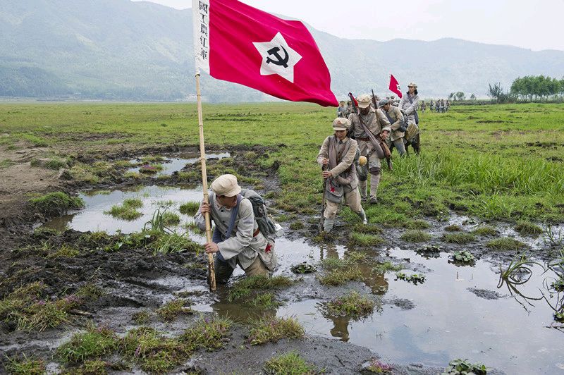 莽莽乾坤,赤帜高擎,壮志迈前。看铁流奔涌,风餐露宿;雄师奋进,越岭翻川。赤水奇兵,金沙巧渡,大渡桥横铁索寒。征程险,任狂澜恶浪,勇毅如磐。