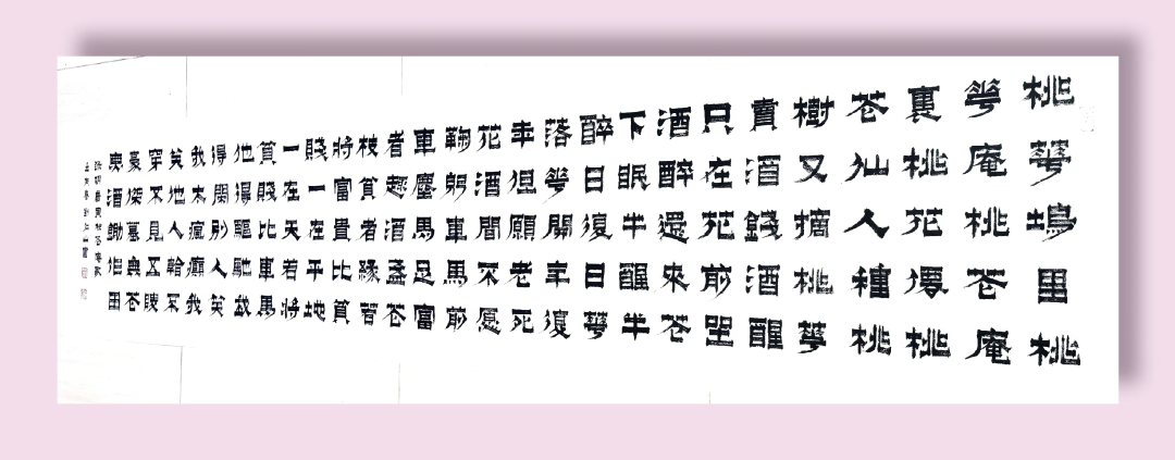 其隶书作品生动而富有变化,无论是波磔纵肆抑或蚕头燕尾,均溶入了传统碑帖的浑厚古拙,端庄秀美,和其独有的时代艺术风格,给人以视觉上的美感冲击。