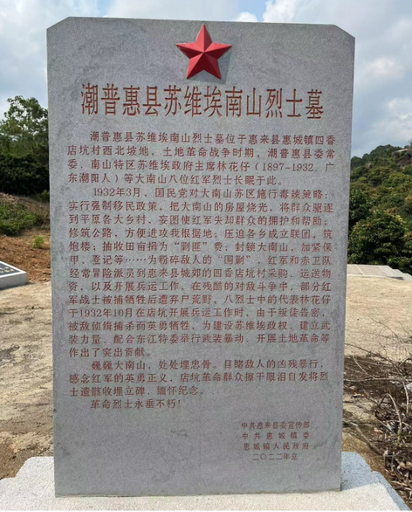岁月无言,石刻为证。我仿佛看到了当年红场阅兵、烽火连天的场景。这里是林花仔烈士工作和战斗过的地方,更曾是中共东江特委和潮普惠县委的领导和指挥机关。彭湃、徐向前、李富春、邓发、方方、古大存等无产阶级革命家曾在这里点燃革命火种,领导大南山地区人民的土地革命斗争。在那风起云涌、波澜壮阔的革命过程中,涌现了许多可歌可泣的英雄人物,如方汝辑、刘大刚、陈开芹等。潮阳区党史办在《林花仔同志革命史简介》中有这样一段文字表述:“林花仔同志在土地时期的革命斗争中,为建设苏维埃政权和建立武装力量的组织准备,配合东江特委部署攻打城镇,举行全境暴动,开展农民运动,建立农民协会等革命工作中作出了突出的贡献,在中共潮阳地方组织史册上留下闪烁的名字!”