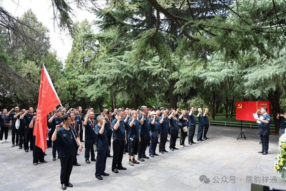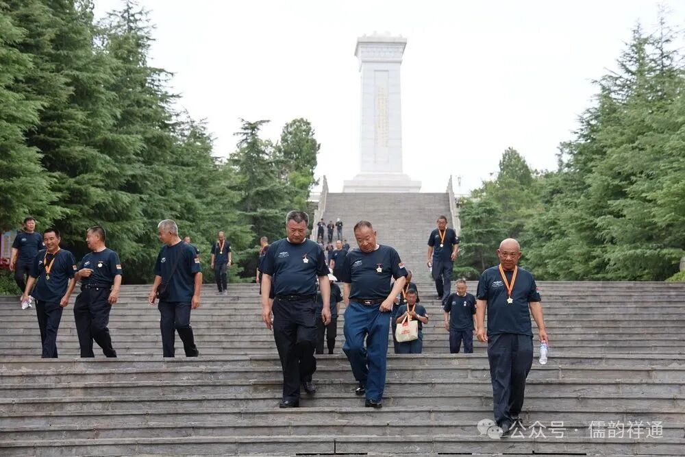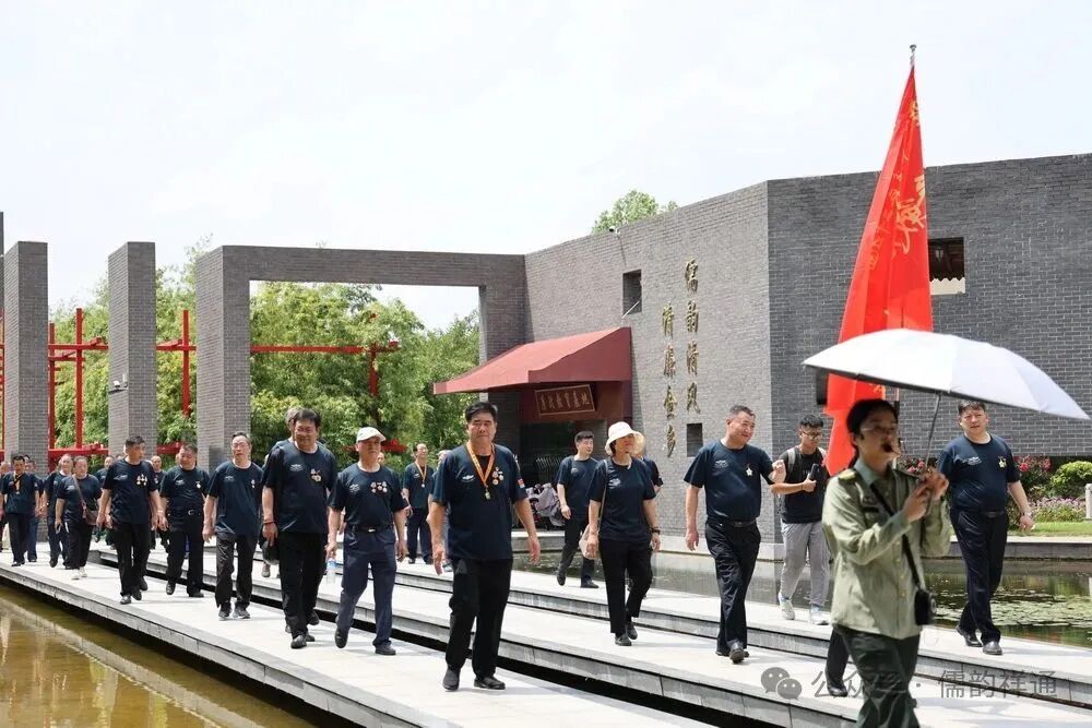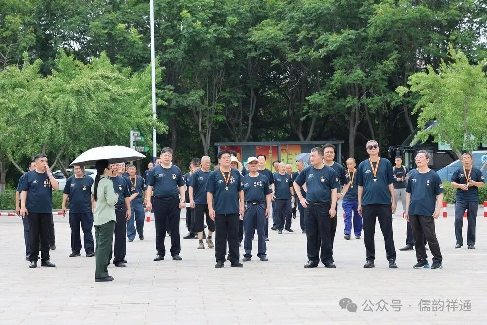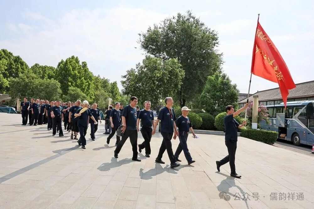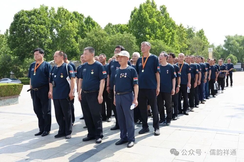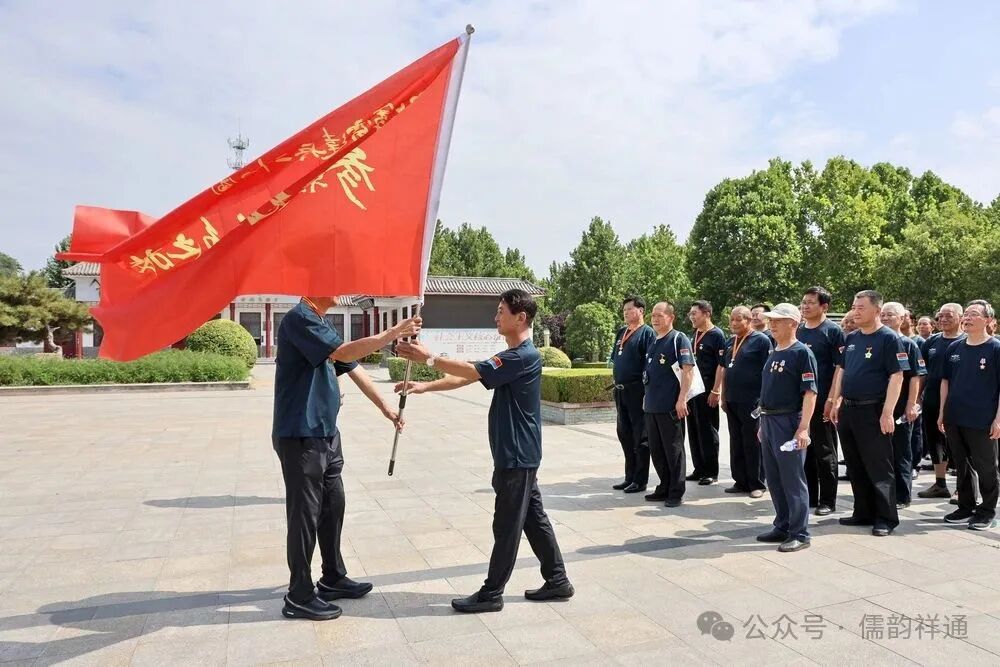 车厢里的欢歌笑语还未停息,随着司机轻轻一脚刹车,将众人从重逢的热络中带入到对历史的追思。大巴车缓缓驶入鲁西南战役纪念园门前广场旁,老兵们精神矍铄,步伐铿锵地走下车,迅速集合列队。在庄重的氛围中,林存弟政委向参战老兵苏兴华郑重授旗。那面印有“空七军雷达兵二十五团参战老兵红色之旅”的红旗,在风中烈烈招展,仿佛在诉说着老兵们往昔的峥嵘岁月,也承载着他们对红色历史的敬畏与传承。