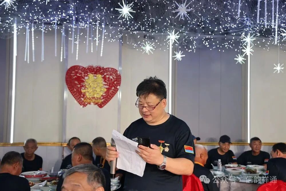 还深情的朗诵了战友贺文键为八一欢聚创作的七律诗《“八一”节致战友(三章)》,诗中的每一句都饱含着战友间的深厚情谊和对节日的美好祝福。