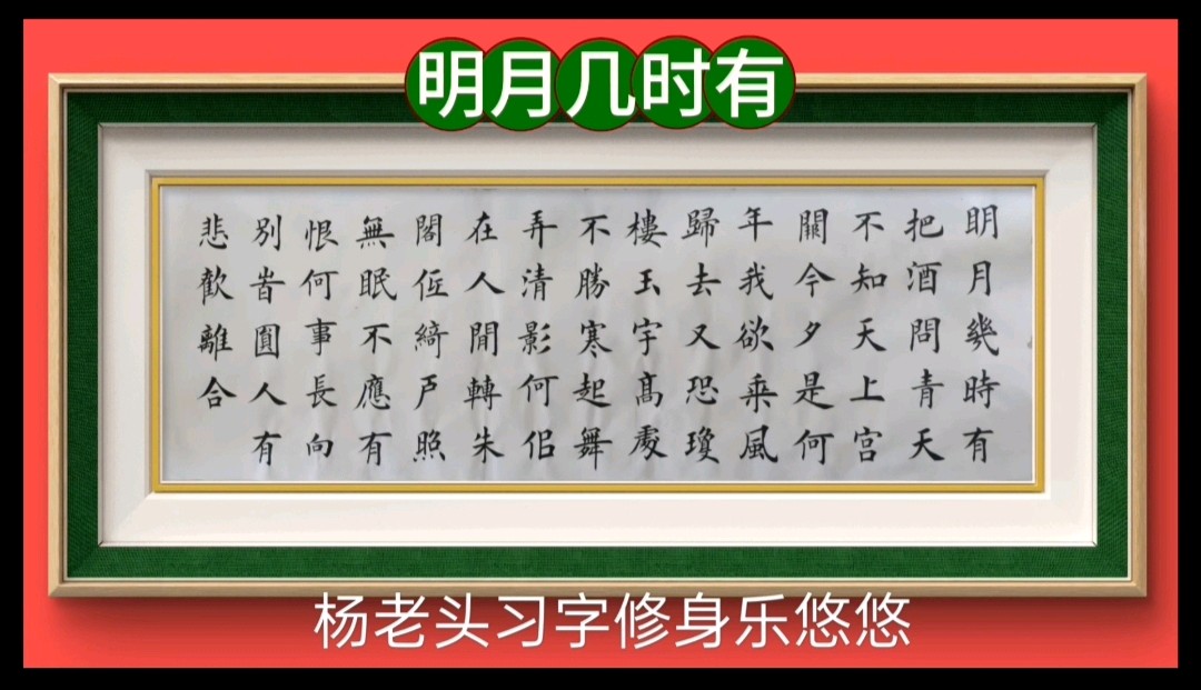 今日写楷书,“明月几时有,把酒问青天”,杨老头把“明”字牢记在心里头,胸有成竹,写得多么投入,那字体显得非常纯熟。每一笔都并济刚柔,又有灵动又有力度。随着杨老头写字的时候,仿佛瞬间看到了苏轼左手拿酒,右手拿笔又在挥舞,仰天问月的豪迈风度。“不知天上宫阙,今夕是何年”,杨老头的笔速加快了进度,笔画之间的结构更加值得研究研究。“宫”字的宝盖头,好像宫殿一样沉稳长长久久。这时候,仿佛随苏轼的思绪穿越飞向了天宫。