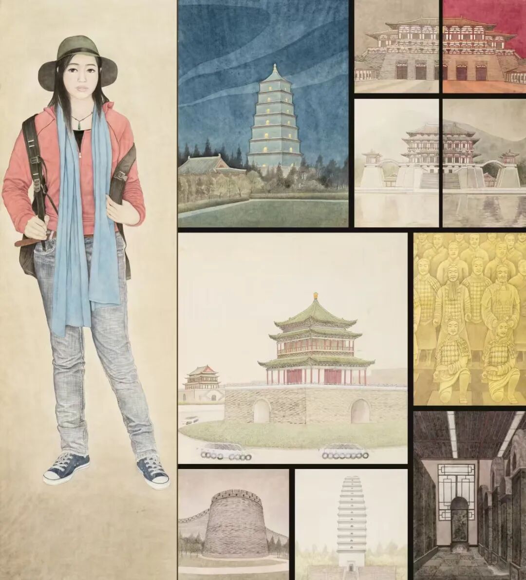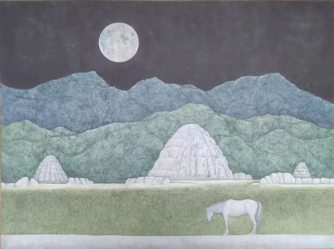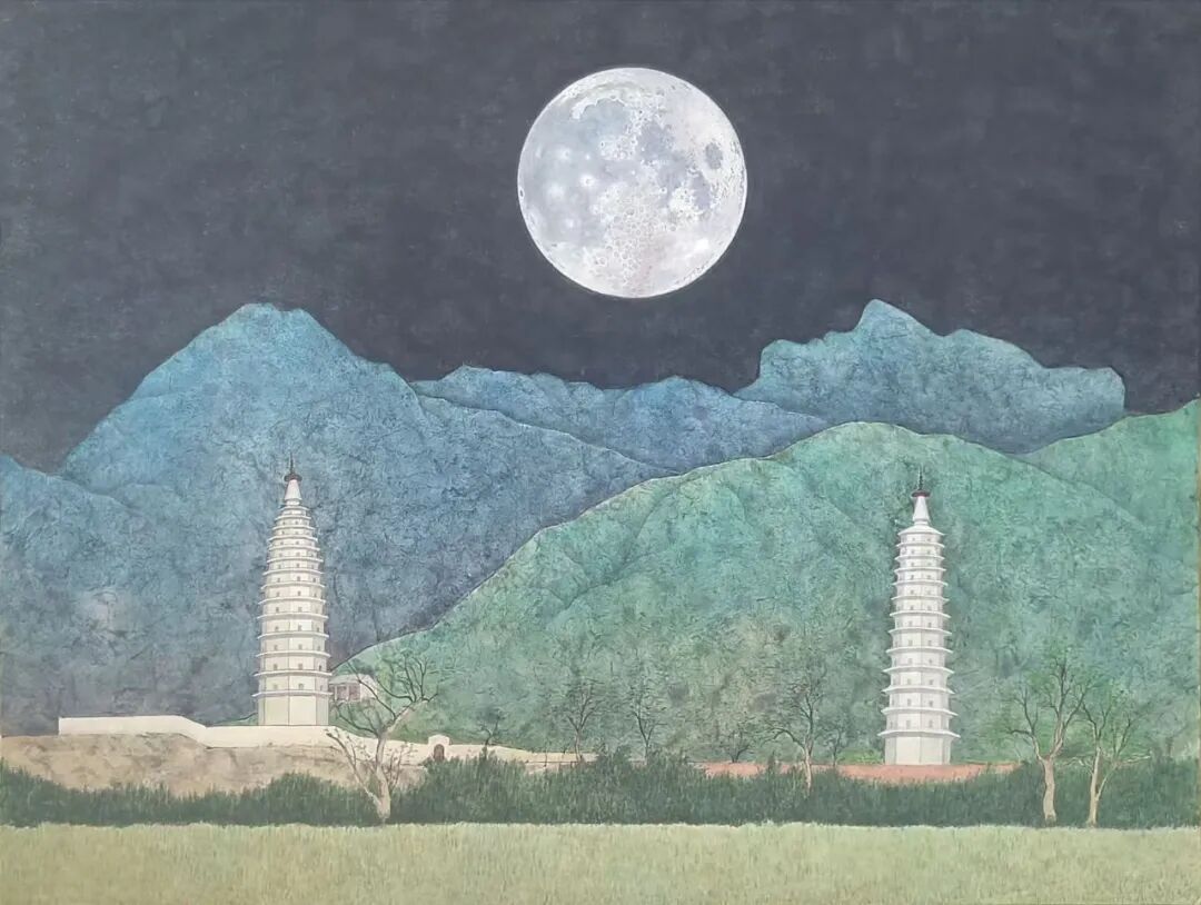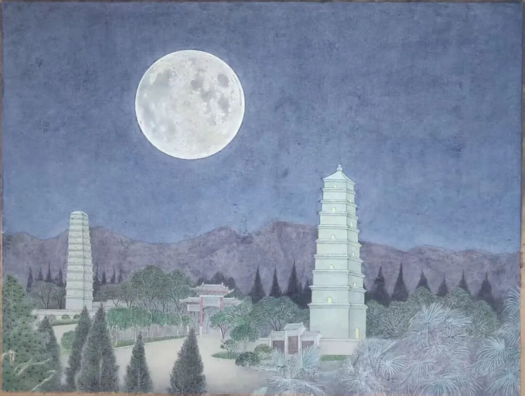 欣赏先生笔下的众幅写生风景图,诸如《青木川鸟瞰》《荒城月景》等等。画中独属于陕南的地理风情与寂寥月色,在先生笔下皆是得以复现,特别是工笔画特有的宁静克制,反倒是成就了其画面更为磅礴苍茫的情感张力。那些反复罩染的云霞,那些精心打磨的月光,也都源于先生在写生过程中的深情寄怀。将地理印记转化为心象记忆,让创作可以翱翔于精神的苍穹,同为观赏者,我敬佩先生的艺术品质,同时也更赞叹于他那跋涉在自然与历史中的写生足迹!
