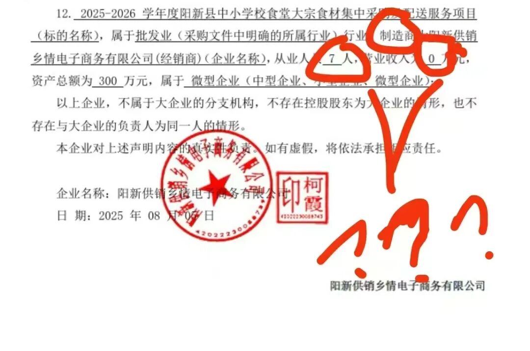 另一位市民陈某亮表示,他对阳新供销乡情电子商务公司作出的《中小企业声明函》很是质疑,公司称自己是生产商、制造商,请问生产许可证有吗?其实什么都没有,只是一家从业人员仅有7人,营收为零的“壳子”公司,像这样,全县十几万中小学生的饮食安全交给这样一个临时包装的微型企业,教育局放心,领导放心,我们全县几十万家长不放心哪!