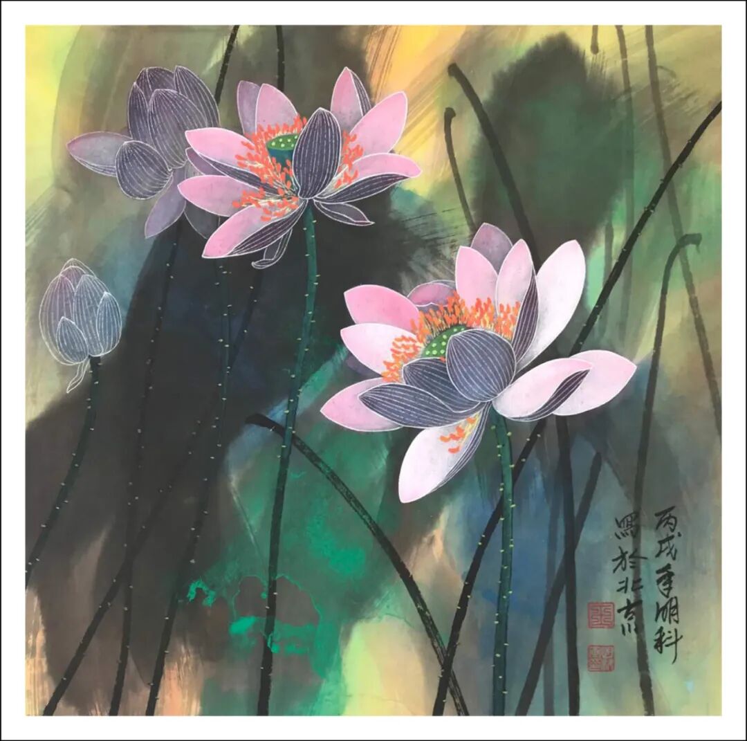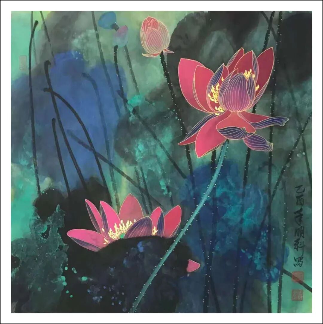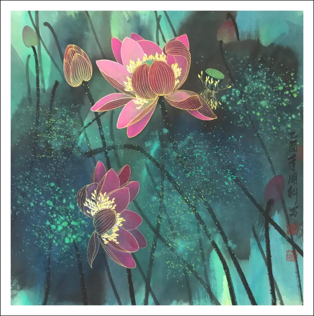 宣纸以轻铺展,笔墨恣意而落,于是墨色雅彩生发禅意悄然,一件最妙的荷花作品唯美呈现。著名画家王明科数十年兼工带写风荷池水,执笔凝神总与千年荷魂对话,泼彩处云烟漫卷,工笔间经络分明。他铺陈名师传授的工笔精髓,驾驭泼墨泼彩的豪情,各门各派冶于一炉,在荷花主题创作中既见宋元古意又具现代气韵,彩墨荷写乾坤,叶翻卷如碧浪叠涌,金波搅动满纸生机,在氤氲水气里莲花若凌波仙子,恰是兼工带写,脱略凡格最妙!