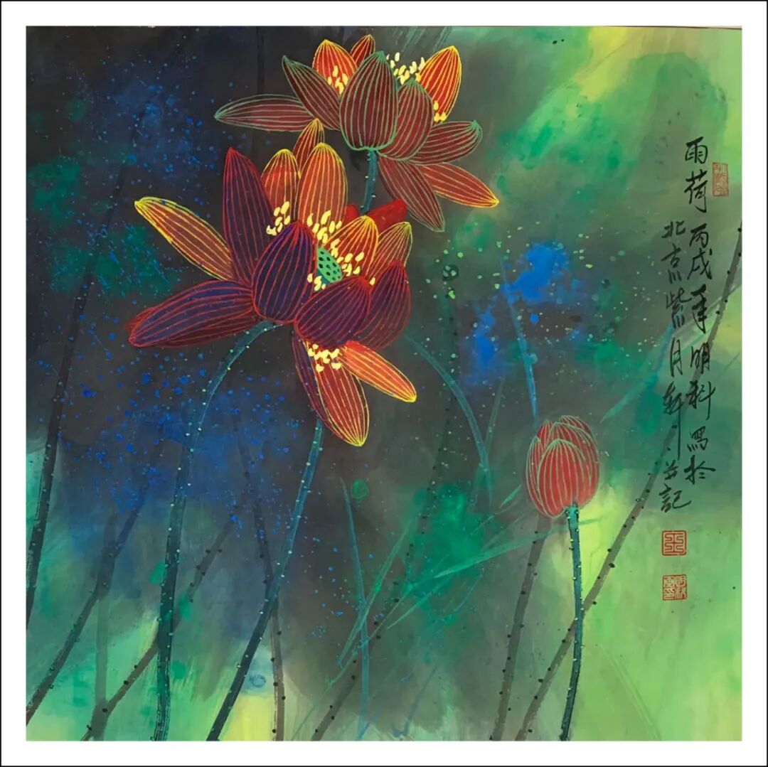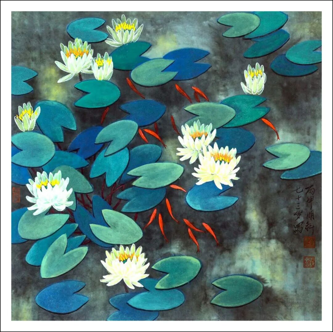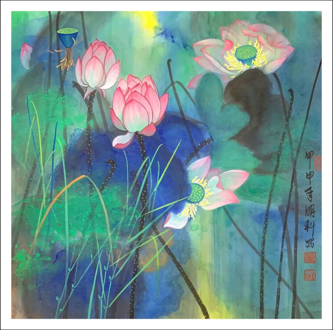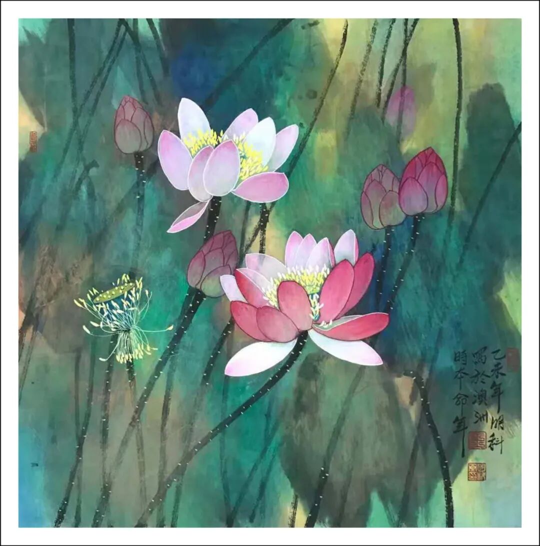 王明科先生的荷花作品将西式光影与中国笔墨熔铸,中通外直,贯通古今,果然是墨香常伴诗韵起,艺术从来非独行。甲辰年澳大利亚画院举办中西绘画作品展后,王明科与诗人李作恆花赋荷题奇观,画家按诗人“清水河塘锦鲤游,安居乐业福中求”的赋荷诗创作工写彩墨荷花,并按此诗句题画意,把画家泼墨泼彩和游鱗戏藻的情景表达得出神入化。这泼染七层彩墨,妙续新笔的优品,正是十日画一水,五日画一石的匠心别至!诗画唱和,诗圣洁莲花,画脱俗之品,文人相重的精神在画里画外如歌谓赋,成为一段佳话。