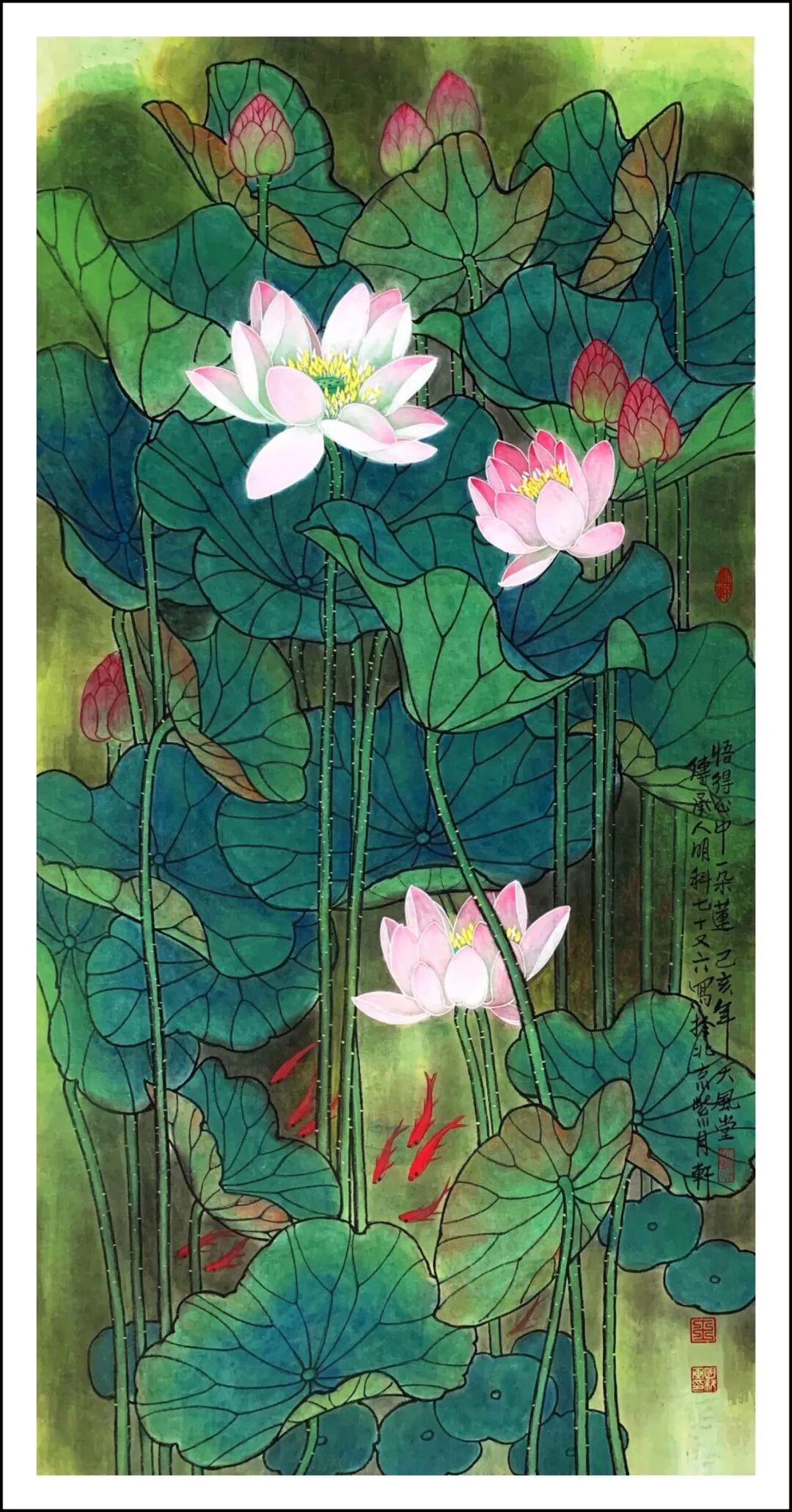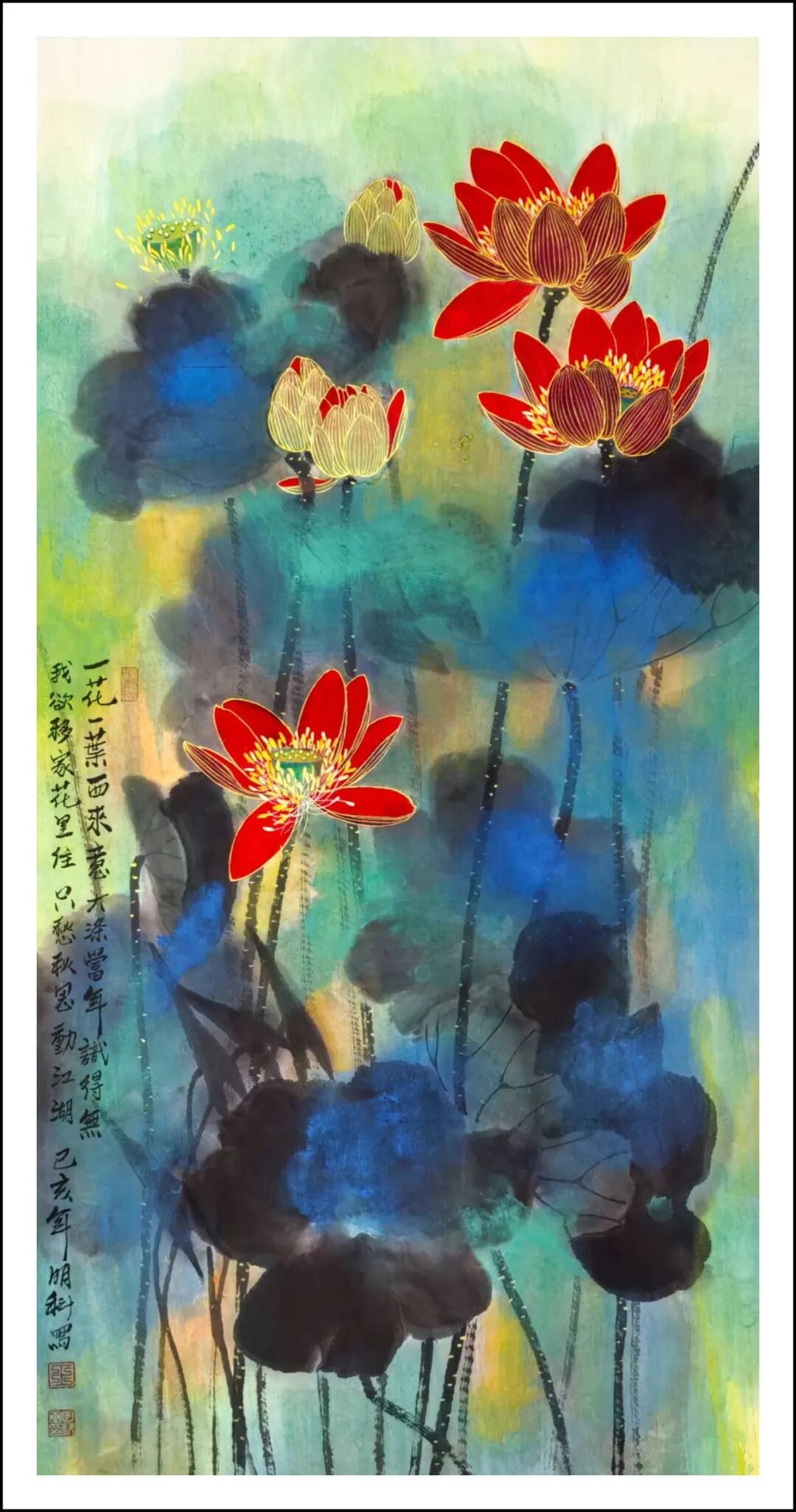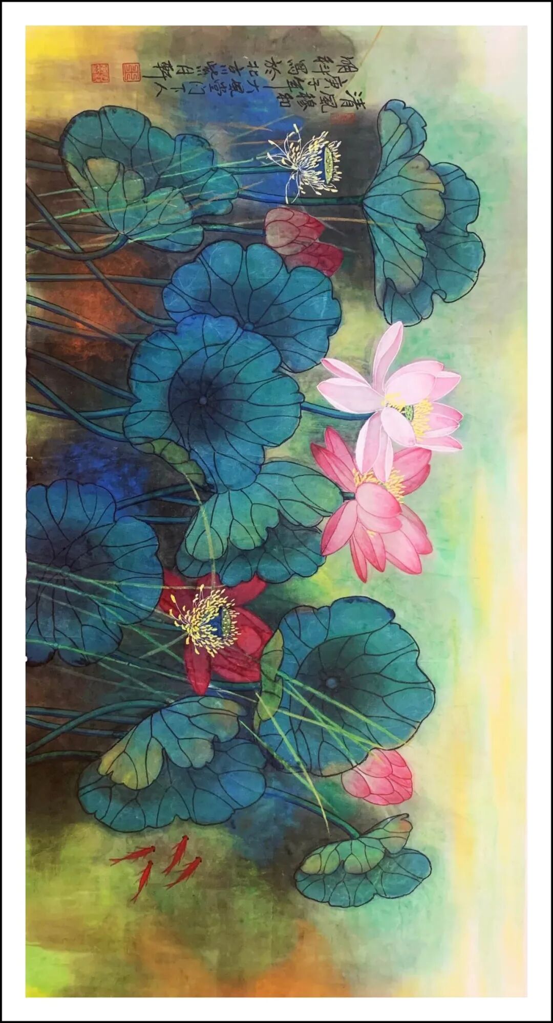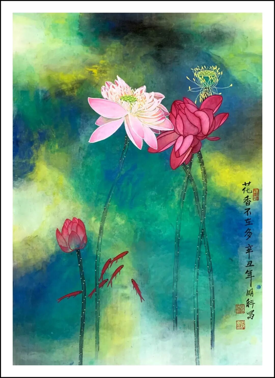 王明科先生的荷花作品将西式光影与中国笔墨熔铸,中通外直,贯通古今,果然是墨香常伴诗韵起,艺术从来非独行。甲辰年澳大利亚画院举办中西绘画作品展后,王明科与诗人李作恆花赋荷题奇观,画家按诗人“清水河塘锦鲤游,安居乐业福中求”的赋荷诗创作工写彩墨荷花,并按此诗句题画意,把画家泼墨泼彩和游鱗戏藻的情景表达得出神入化。这泼染七层彩墨,妙续新笔的优品,正是十日画一水,五日画一石的匠心别至!诗画唱和,诗圣洁莲花,画脱俗之品,文人相重的精神在画里画外如歌谓赋,成为一段佳话。