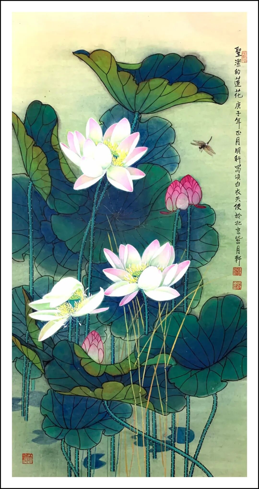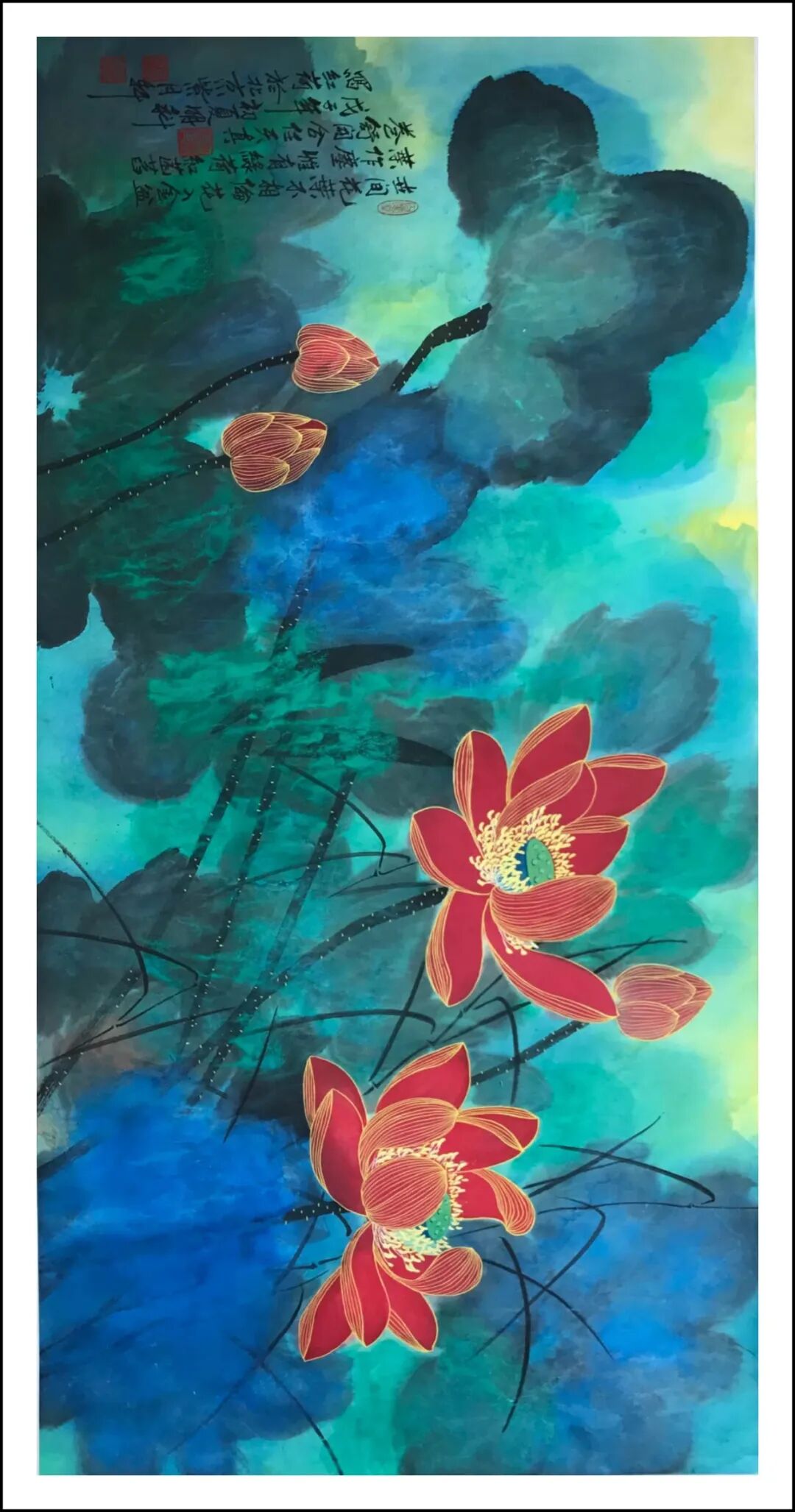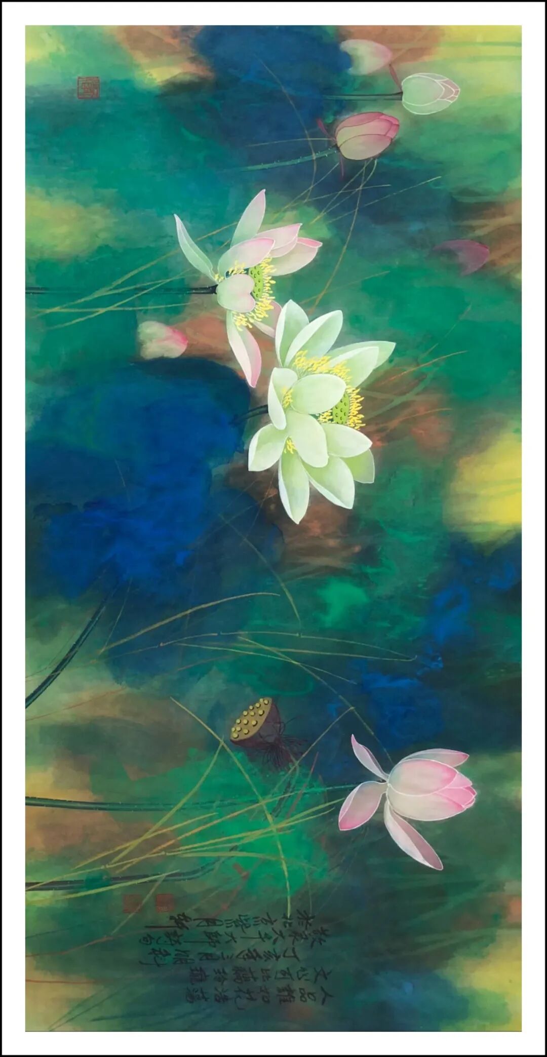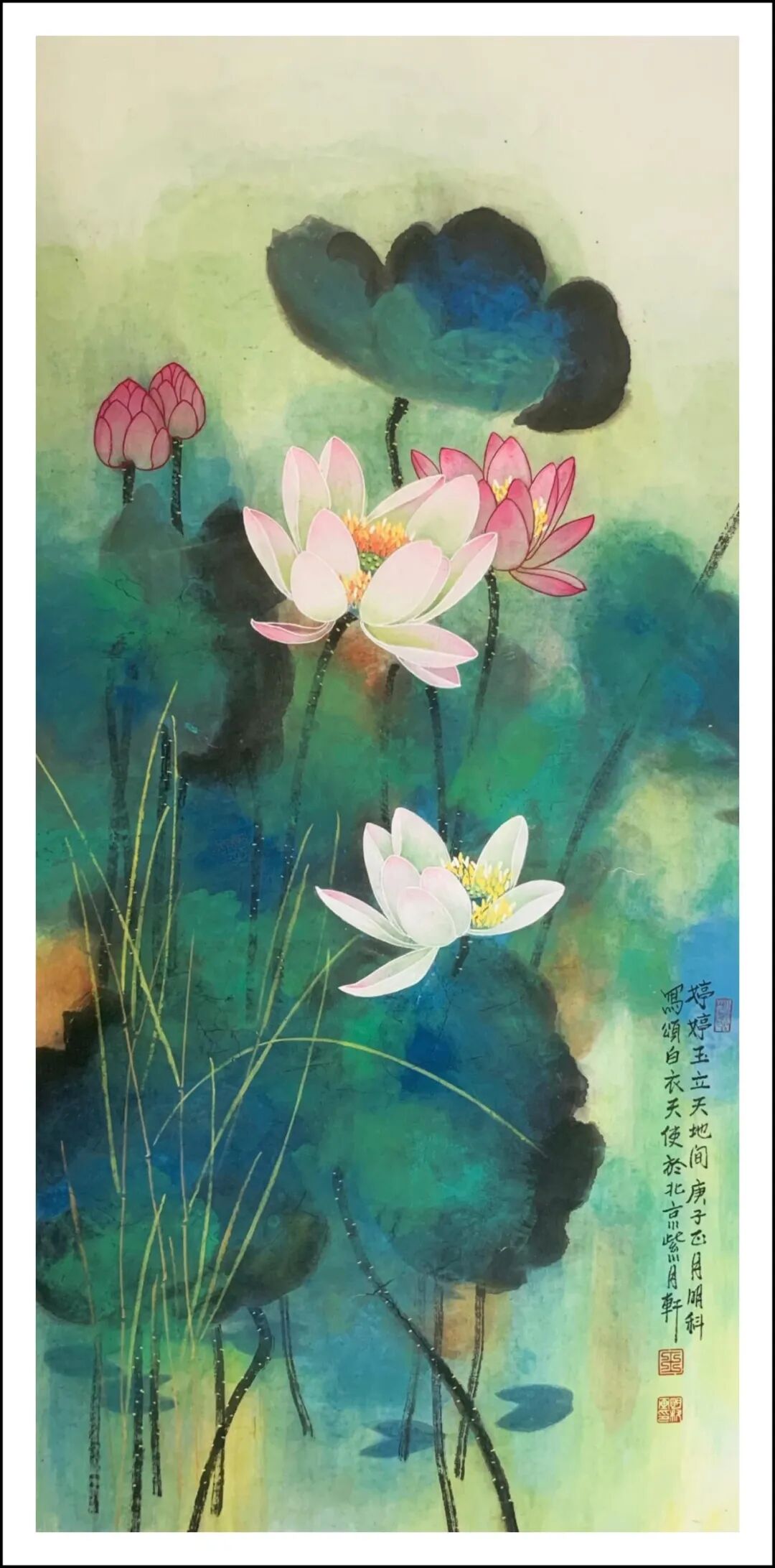 心中莲开净碧中 生宣工写彩墨 136x68cm 2019年 王明科