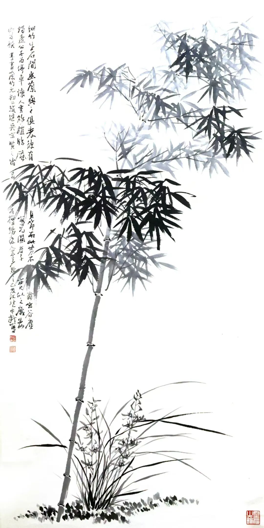 花鸟画则以“文人意趣”破“院体工细”,尽显纵逸雅致。《菊石图》(1986)中,三株歙菊以“没骨法”绘就,淡粉、浅黄的花瓣无需线条勾勒,仅以色彩晕染便显生动形态;石体用“折带皴”枯笔勾勒,墨色浓淡相间,肌理感十足。其笔墨简淡源自元代王冕“墨梅”的疏朗,纵逸意趣则受明代徐渭写意影响,题跋“故里秋深菊正黄”更将物象与乡愁相融,实现“物—情—理”的文人画核心追求;《梅竹双清图》(1993)则以简练笔触写梅枝、以劲挺线条绘竹干,墨色浓淡对比鲜明,尽显“梅寒竹劲”的君子意趣,是吴门画派写意精神的当代延续。