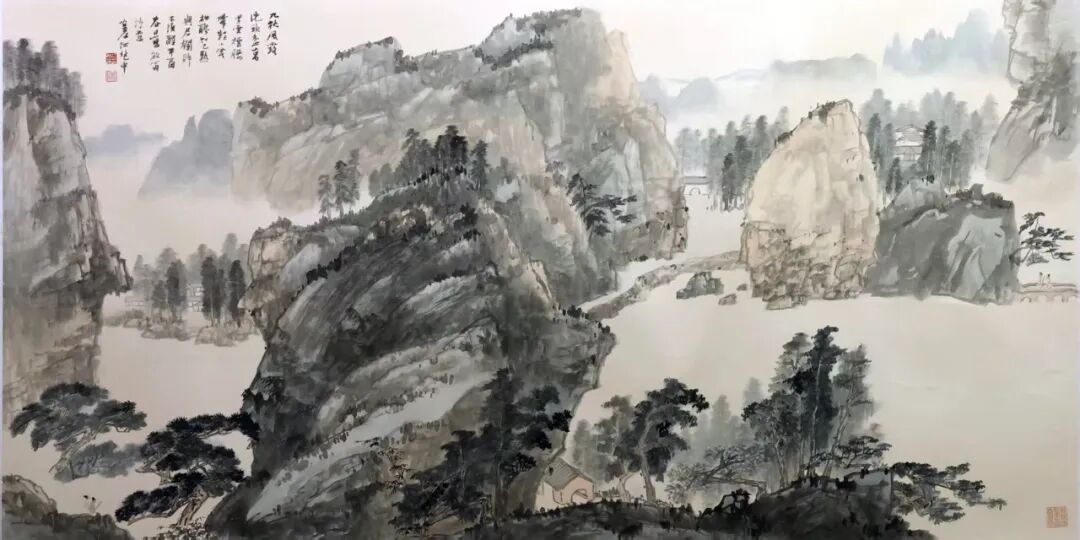 早期《秋山读书图》(1970)是典型范式:丘壑布局承袭宋人范宽、郭熙的“全景式构图”,主峰巍峨居中,次峰错落呼应,以严谨的空间层次再现宋代山水的雄浑骨力;笔墨则取法清代“四王”的“披麻皴”,线条温润细腻,墨色从淡到浓层层递进,既保留“四王”笔墨的雅致,又避免过度程式化,实现“宋骨清韵”的平衡。色彩上遵循“随类赋彩”传统,远山以花青晕染、近坡用赭石敷色,冷暖对比间藏自然灵秀,尽显文人画的雅致品格。