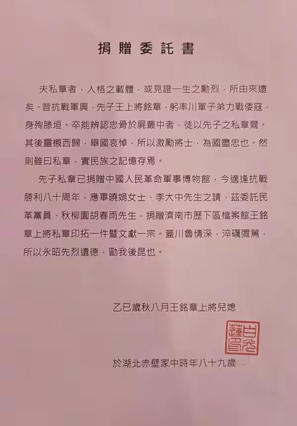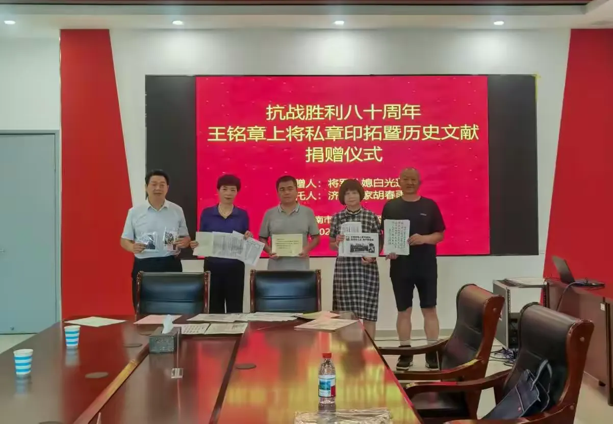 在中国人民抗日战争胜利八十周年纪念日来临之际,8月28日,历下区档案馆举行了一场意义非凡的捐赠仪式。山东鹊华律师事务所主任、济南市天桥区政协委员、民革党员、作家胡春雨先生代表抗战名将王铭章上将儿媳白光莲女士,向历下区档案馆捐赠王铭章将军私章印拓,同时,胡春雨先生捐赠《抗战胜利八十周年新都滕州两地颂川军英烈文》公祭现场诵读祭文原件,附滕县保卫战八十周年、八十五周年公祭现场祭文打印件,及三篇祭文电子文档。