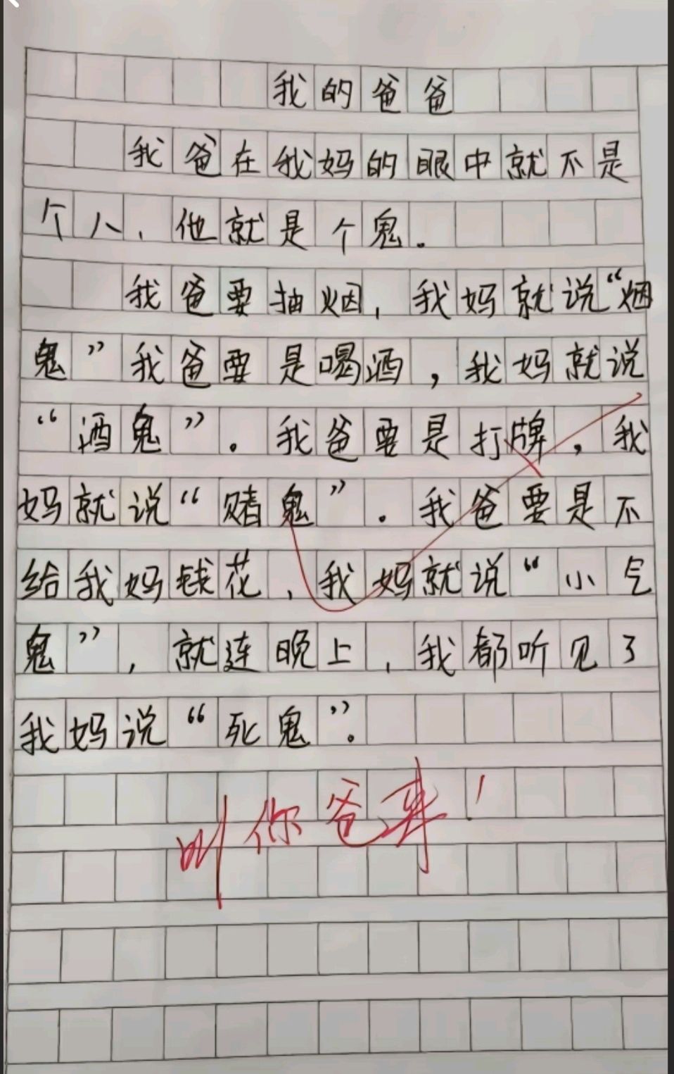 现在来看小明怎么写?他写的是不是优秀的作文?只有看了以后再评论:我的爸爸是什么人?我爸在我妈眼中就不是个人,他就是个鬼。我爸要抽烟,我妈就说是“烟鬼”。我爸要是喝酒,我妈就说是“酒鬼”。我爸要是打牌,我妈就说“赌鬼”。我爸要是不给我妈钱花,就说他是“小气鬼”。就连晚上,我都听见了我妈说他是“死鬼”。这作文可把老师感动了一会,提笔写下“把你爸叫来”!我怎么对我爸爸说呢?请你出个主意行不行?