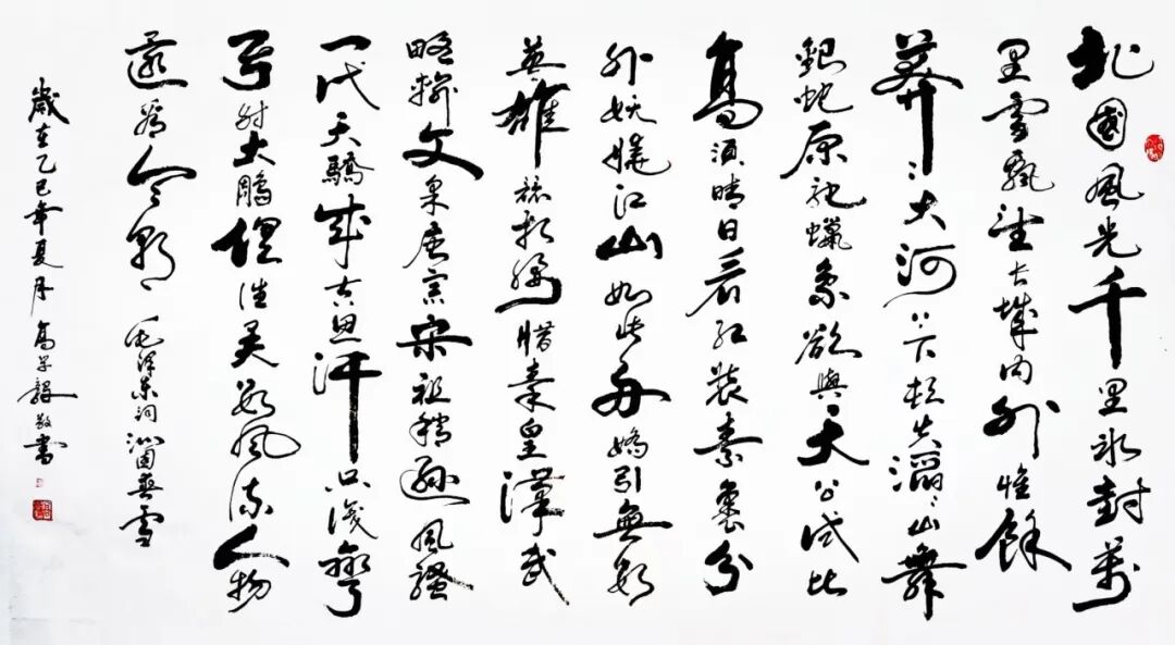 高先生的行草创作尤有个性!结字与节奏都在长期沉浸中化为运笔自如的创作直觉,心手双畅,笔随意行!历练行草形态,他起笔落笔始终与书法史主流相贯通,呈现出有本有源、守正出新的艺术品格,走的是情感表达与笔墨技巧的高度融合的完美路径。观《青玉案》可识他的行草善用浓淡对比与线质变化表达书法美学的遂心应手。粗重若雷云凝重,细轻成游丝连绵,刚柔并济、张力充沛。这种笔墨线条的形成既源自对笔锋提按、墨法枯润的精熟掌控,也与他的文学修养密切相关,让行草的节奏起伏与情感波动相互映照,让书性文意通过疾徐疏密、轻重高低的笔墨线索传达于外,这不仅是技巧娴熟的体现,也是书法家富有文化修养,最终“由技入道”的结果!