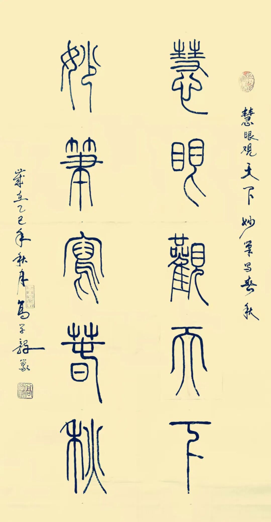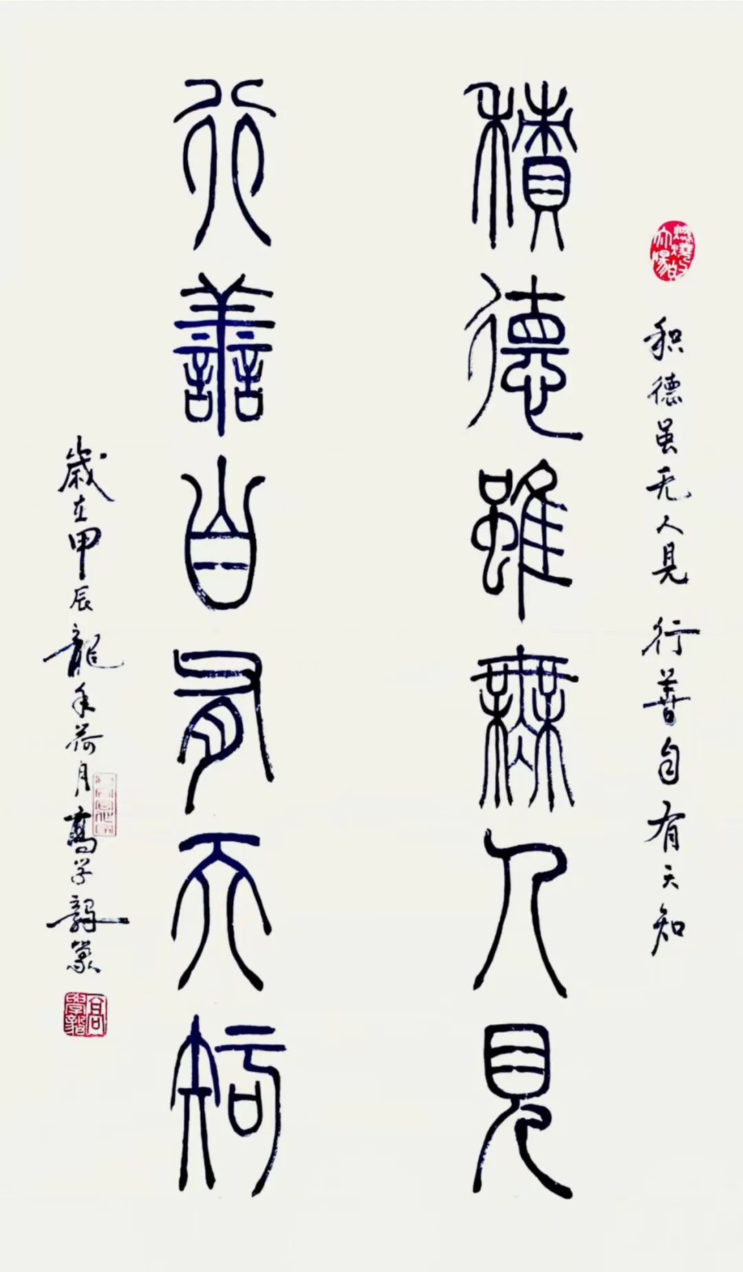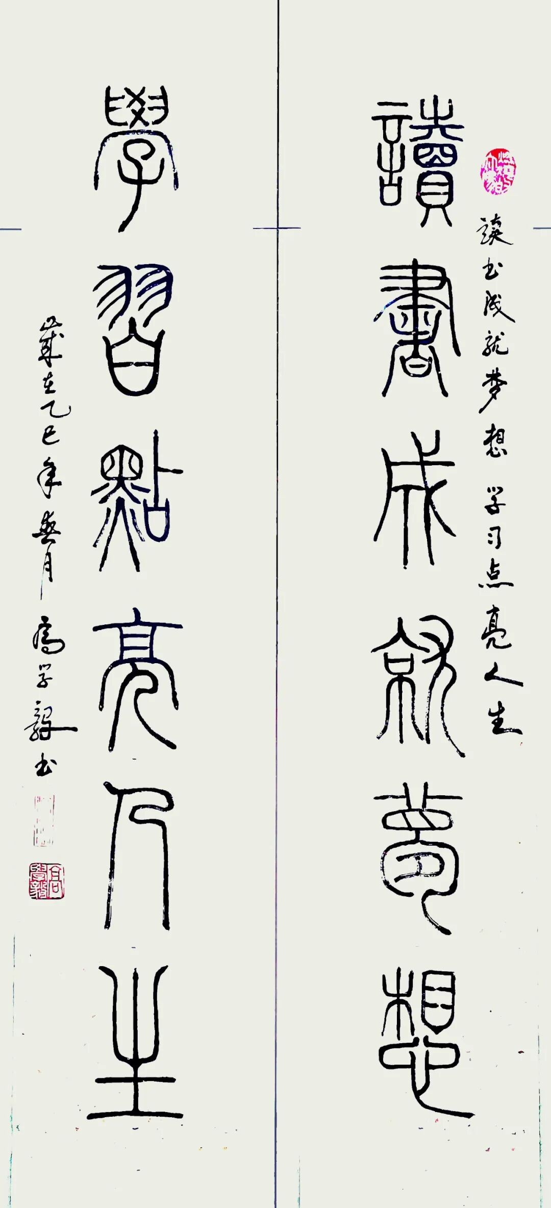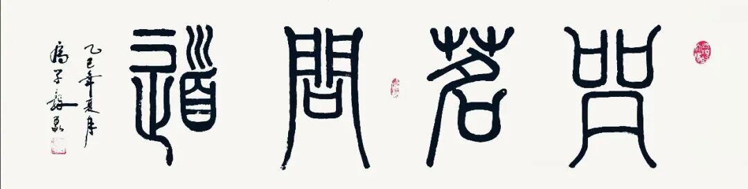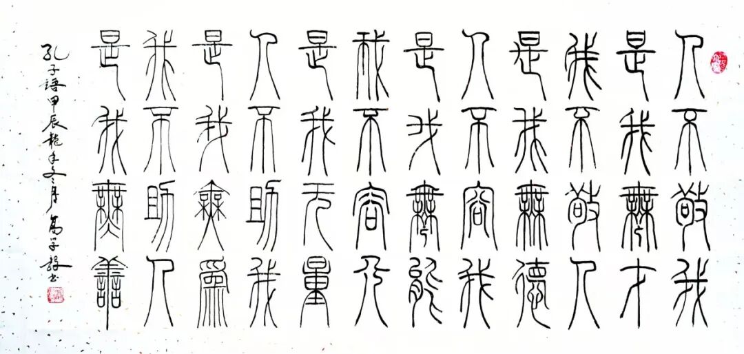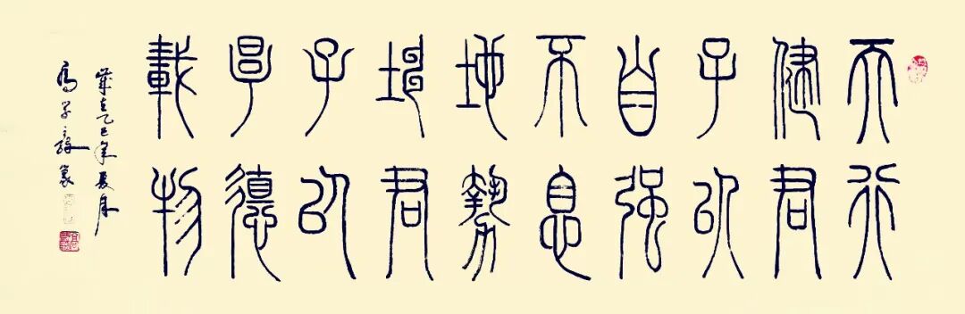 每个人书法艺术的底蕴积淀,必源自对历代经典的深刻研悟与临池积累,高学毅先生也不例外。他琢磨《泰山刻石》《峄山碑》等秦篆典范用工极深,又对二王法帖行草经典有着系统研习经历,可以借古开今地致力于让书法的笔墨精神与审美理想前后相续。于是他所创作篆书作品,其线条凝练如玉箸,内含弹性与力度,干净利落相当耐看,既具“婉而通”的流转韵致,又蕴含金石镌刻般的凝练质感,笔意于匀整中见生机。结体远承秦篆对称平衡的法度,又在严整中寓有变化,通过字形长短、空间虚实的微妙调控,在端庄中注入灵动意趣,可以将古朴的金石气焕发为当代刚健的书卷气,整体写的雅逸灵动,端正典范,实现了书法法度与意趣抒发的高度统一,让当代篆书在形制和精神层面同时达成了新境界。