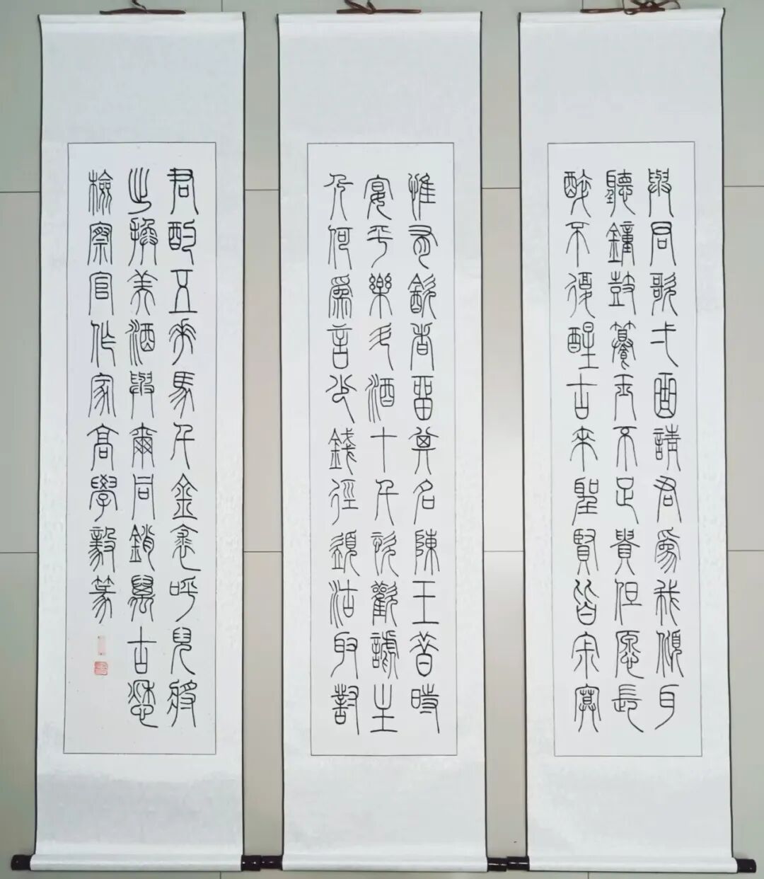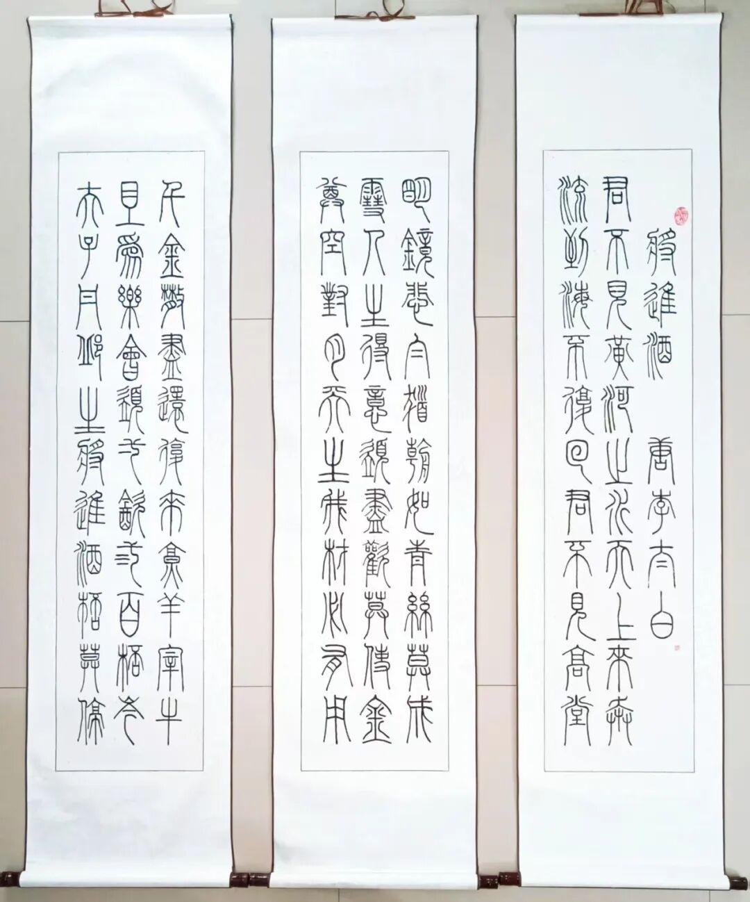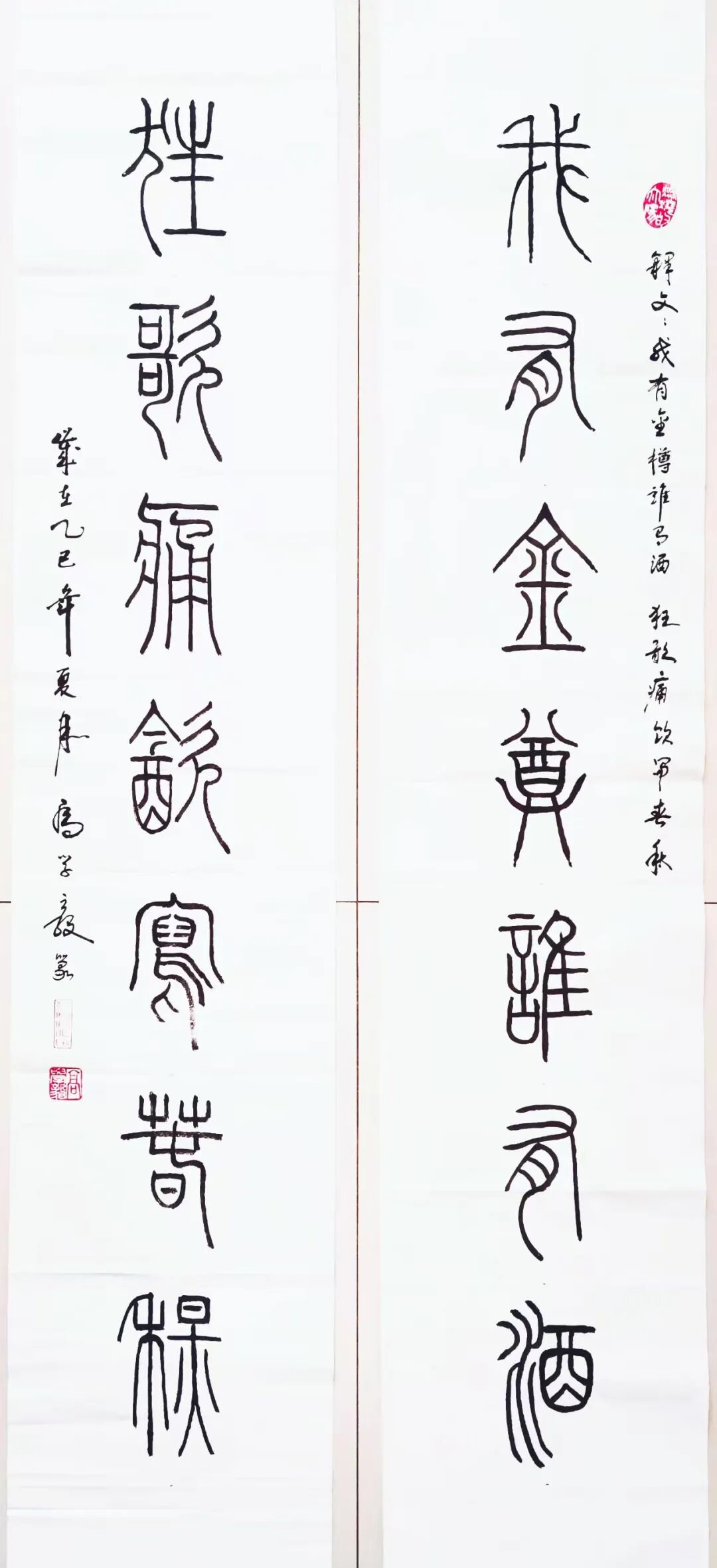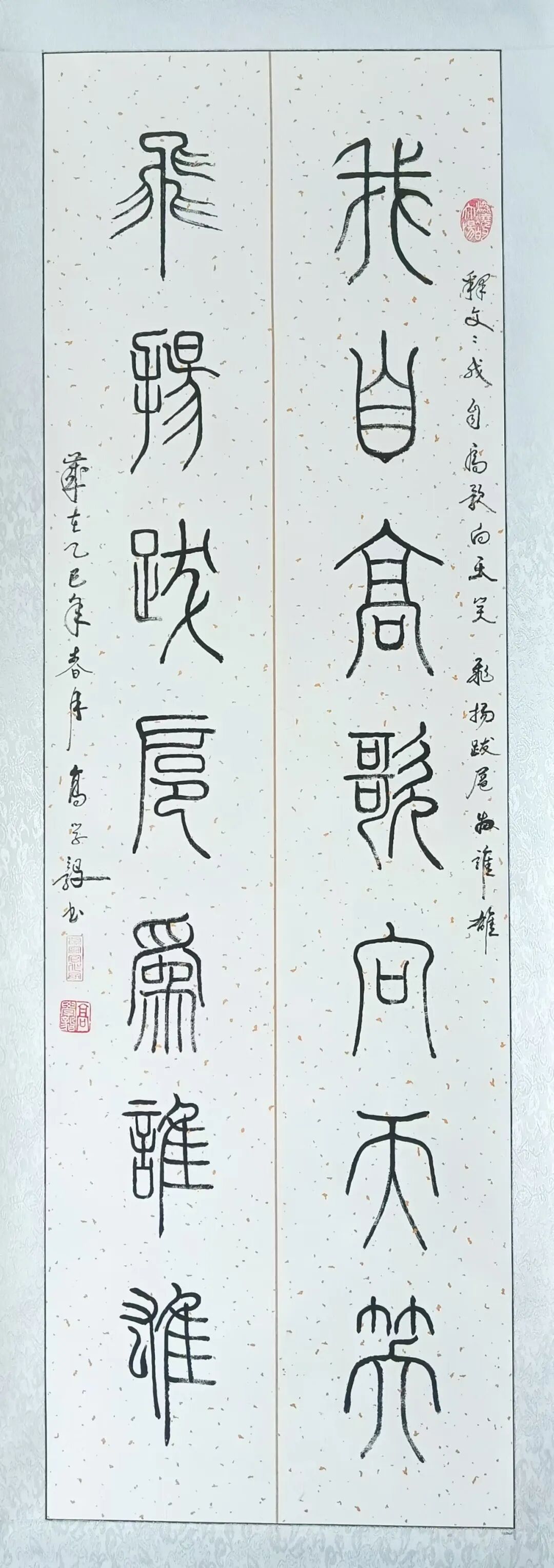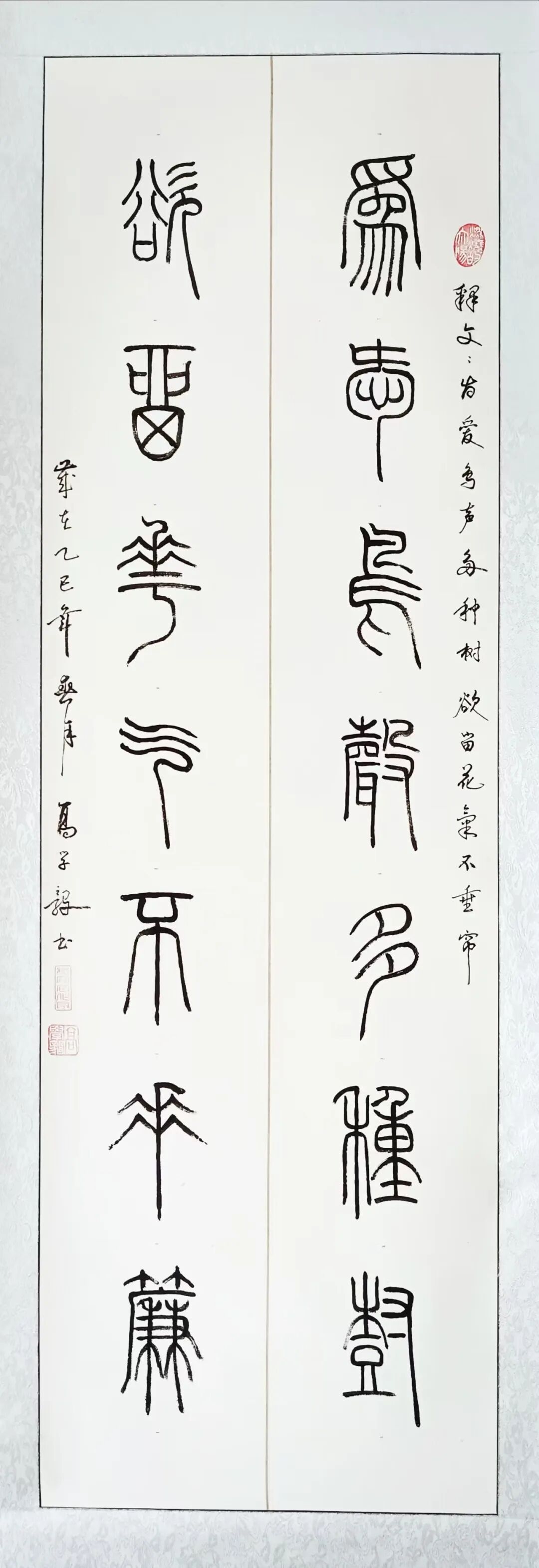 每个人书法艺术的底蕴积淀,必源自对历代经典的深刻研悟与临池积累,高学毅先生也不例外。他琢磨《泰山刻石》《峄山碑》等秦篆典范用工极深,又对二王法帖行草经典有着系统研习经历,可以借古开今地致力于让书法的笔墨精神与审美理想前后相续。于是他所创作篆书作品,其线条凝练如玉箸,内含弹性与力度,干净利落相当耐看,既具“婉而通”的流转韵致,又蕴含金石镌刻般的凝练质感,笔意于匀整中见生机。结体远承秦篆对称平衡的法度,又在严整中寓有变化,通过字形长短、空间虚实的微妙调控,在端庄中注入灵动意趣,可以将古朴的金石气焕发为当代刚健的书卷气,整体写的雅逸灵动,端正典范,实现了书法法度与意趣抒发的高度统一,让当代篆书在形制和精神层面同时达成了新境界。
