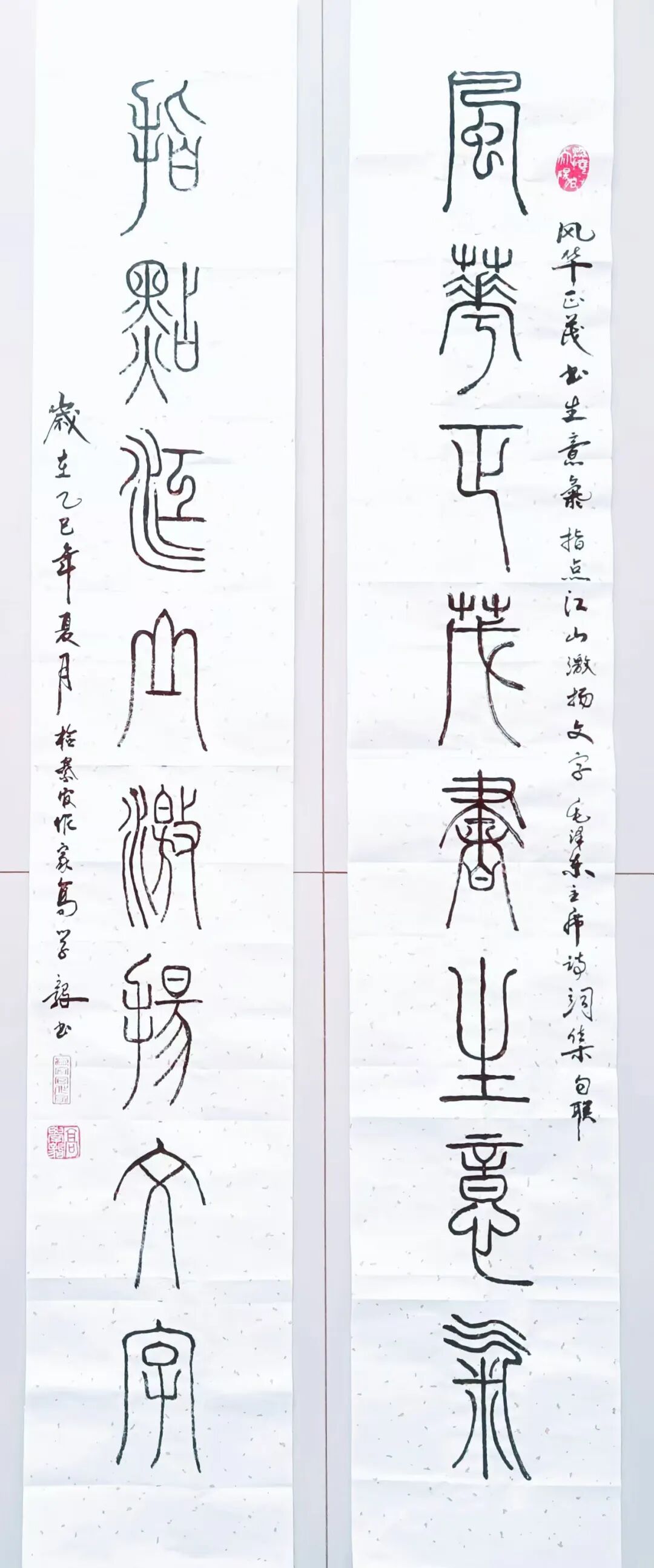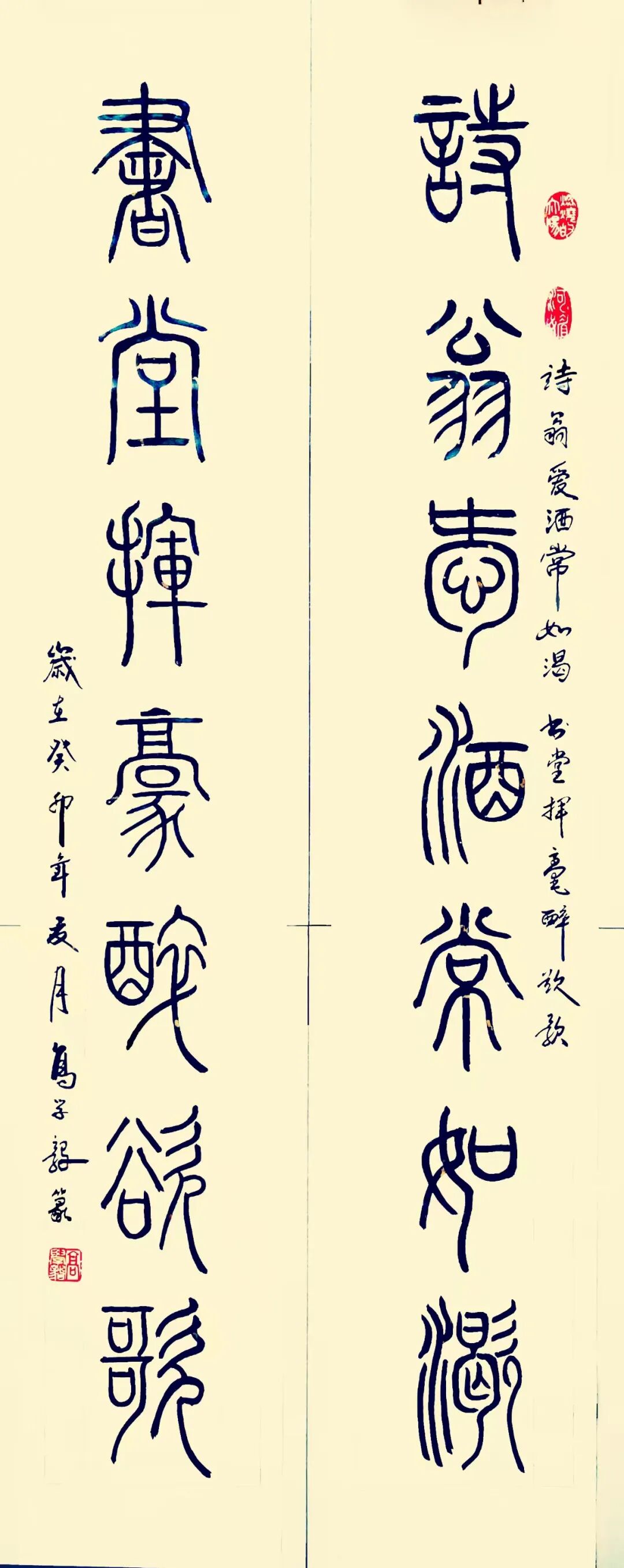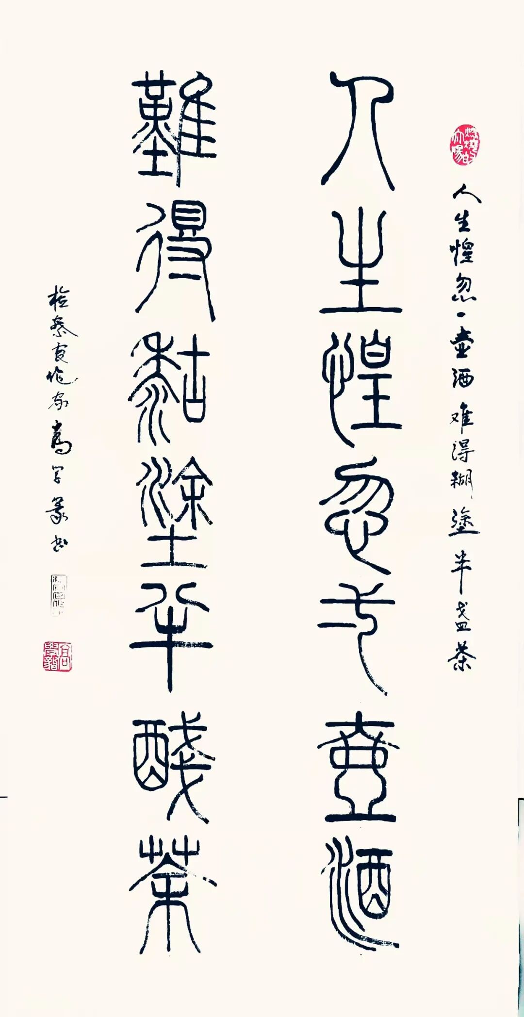 篆续秦碑渡金石,草随晋帖鉴古今。以秦篆为基构建端庄谨严的法度,以行草纵逸奔放抒发现代文人的情志旨趣,构建出既根植传统又面向当代的书法美学形态。从篆书的典雅刚劲到行草的磅礴婉转,每一件作品都是承载着深厚的传统文化基因,每一次挥毫实践也都是传统书法美学在当代文化体系中的精神再建。而其中所蕴涵的文化深度与美学价值,也早已是融入了书法文化复兴的滚滚洪流中,带着延续与创变活力砥砺前行,铸就非凡!