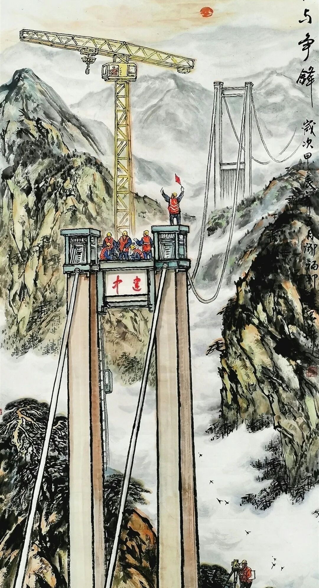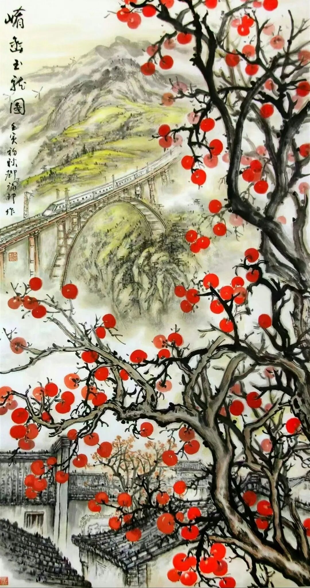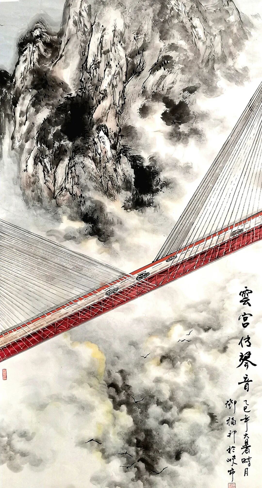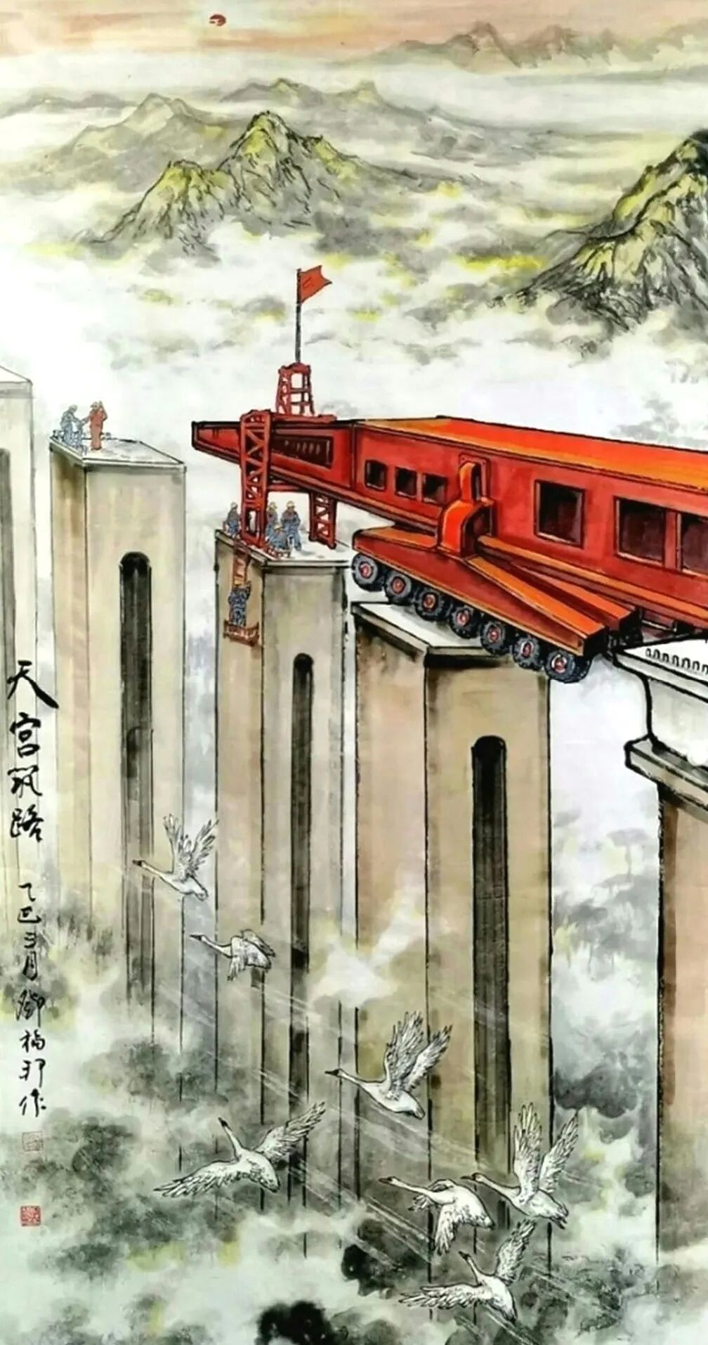 《谁与争锋》《高路变奏曲》等作品直接描绘当代桥梁建设场景,但运用的是传统水墨的表现手法。《谁与争锋》中,建筑工人高举红旗的瞬间被永恒定格在画面上,桥墩上的“中建”字样明确指向当代中国的建设成就,而云雾缭绕的山峦背景和传统题字又将这些现代元素自然地融入山水意境之中。更为巧妙的是他将结满果实的传统柿子树与现代桥梁、列车并置,这种时空交错的处理方式既超现实又和谐统一。似乎在告诉我们,传统与现代并非对立关系,而是可以共生的有机整体。这种艺术处理不仅展现了技术层面的娴熟,更体现了一种文化自信——中国传统文化具有包容现代性的强大能力。《云宫传琴音》和另一幅高铁题材作品则进一步展现了邓福邦对“现代山水”的探索。红色斜拉桥、白色高铁列车这些极具现代感的元素,在他的笔下与云雾山川和谐共存,传统水墨的渲染技法成功表现了现代工程的力与美。题字“云宫传琴音”极具诗意,将现代桥梁比作古琴,体现了画家将技术成就升华为艺术审美的能力。