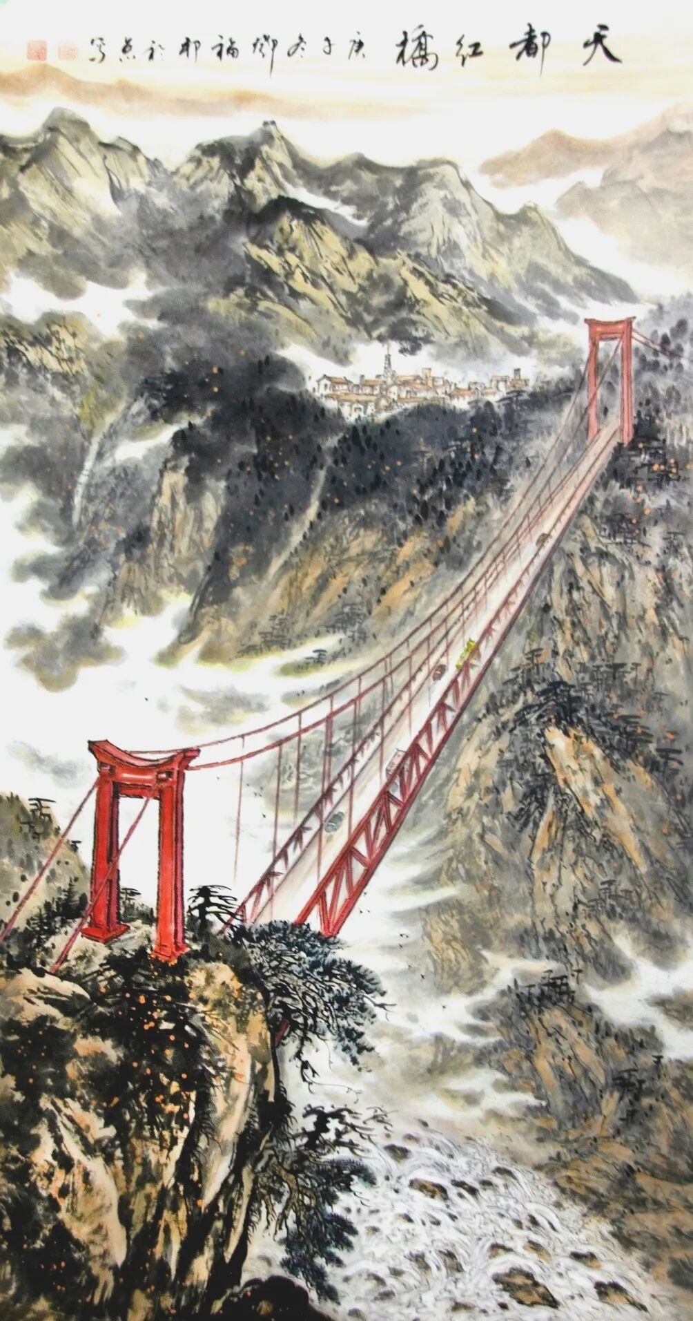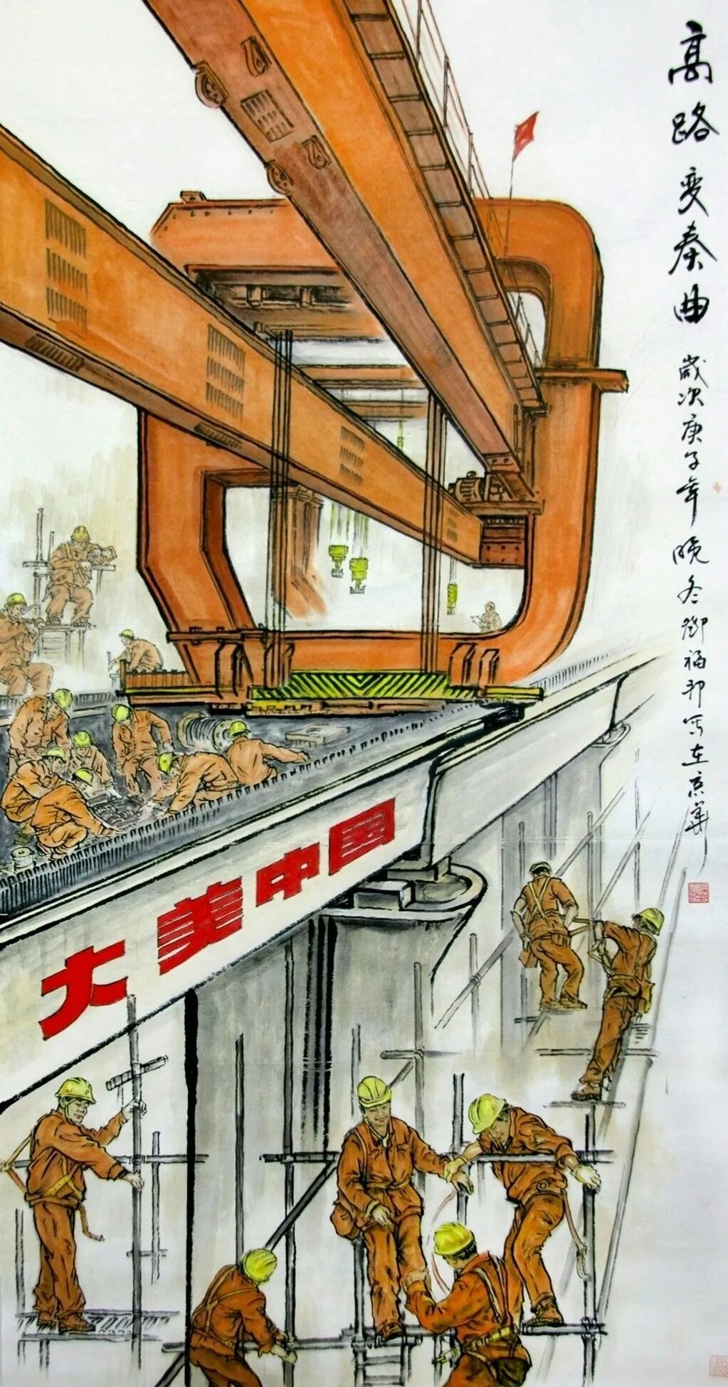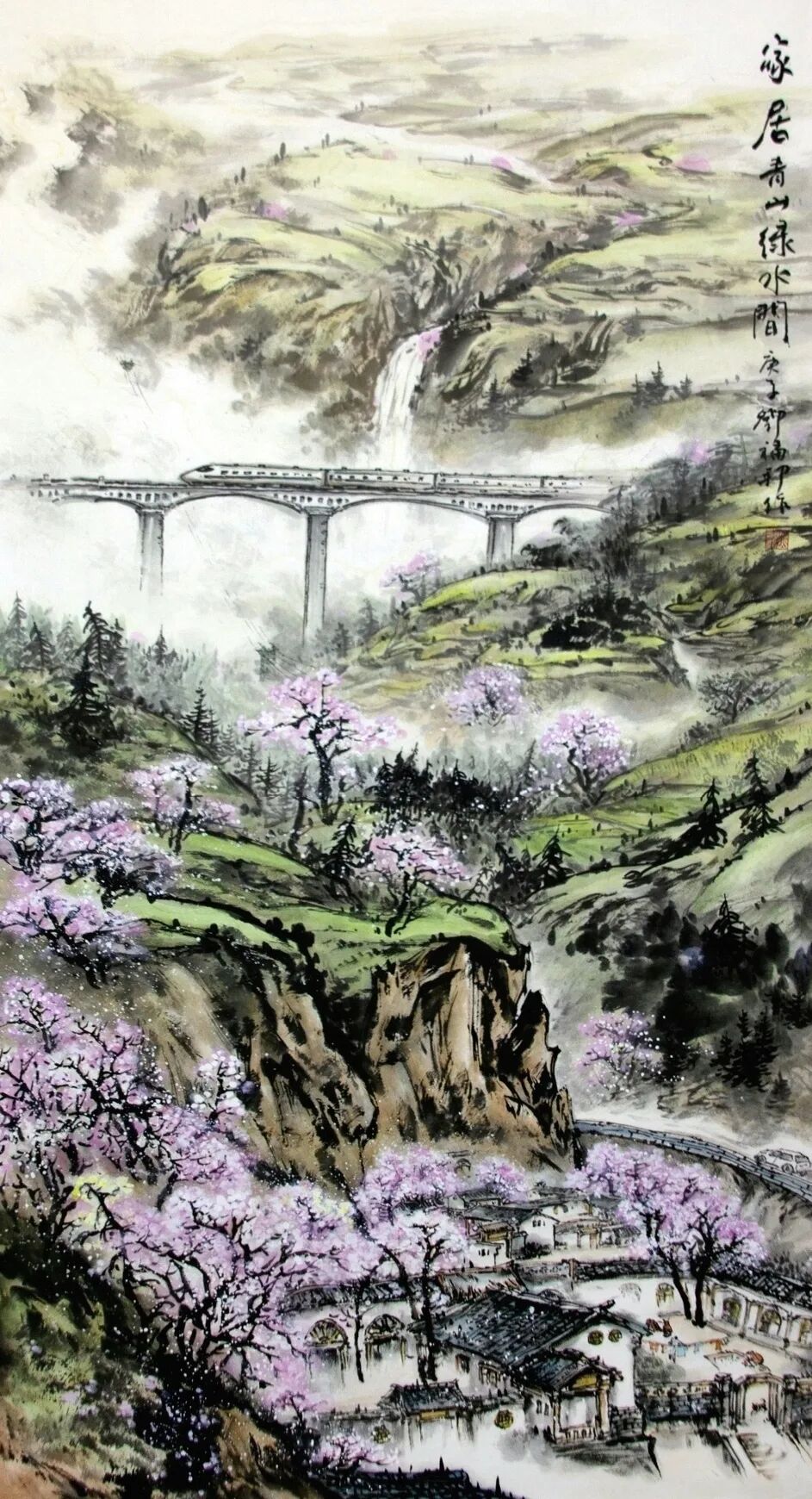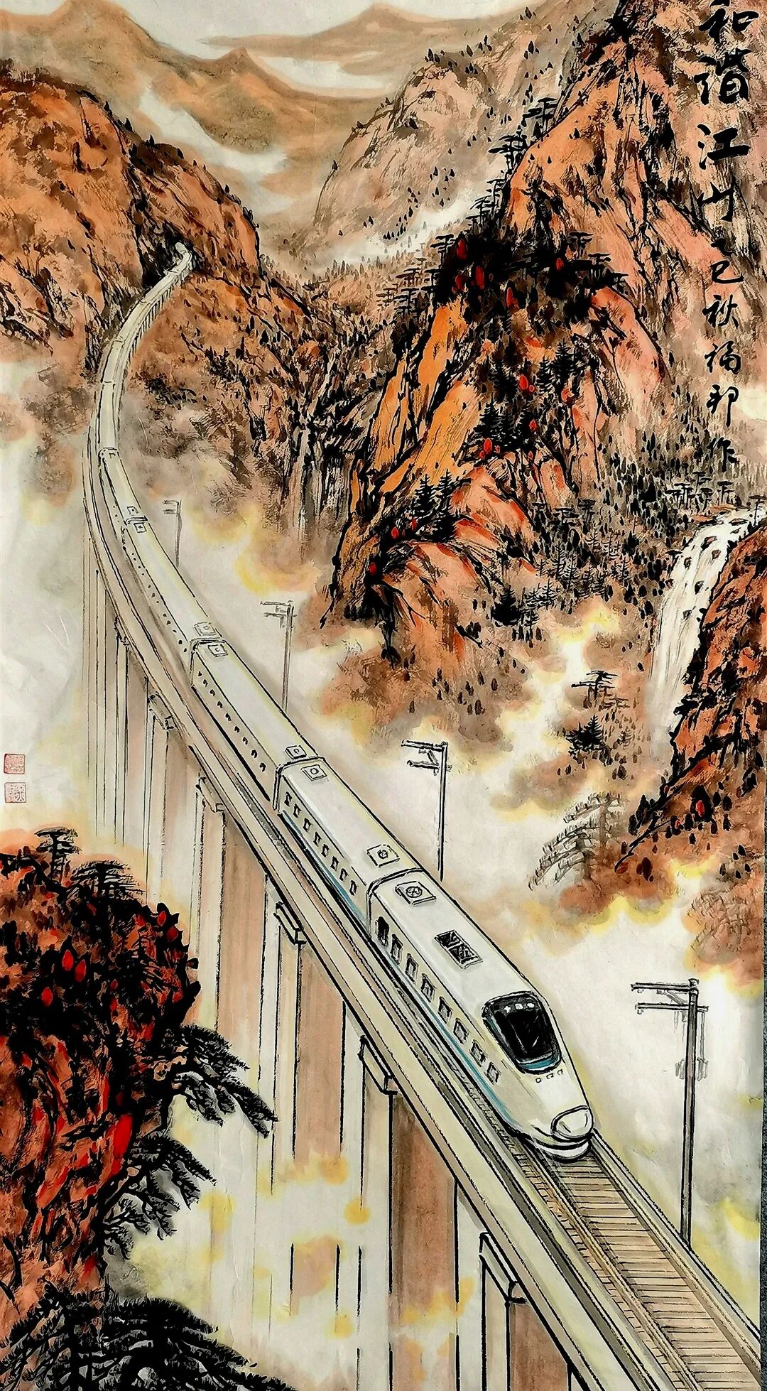 《谁与争锋》《高路变奏曲》等作品直接描绘当代桥梁建设场景,但运用的是传统水墨的表现手法。《谁与争锋》中,建筑工人高举红旗的瞬间被永恒定格在画面上,桥墩上的“中建”字样明确指向当代中国的建设成就,而云雾缭绕的山峦背景和传统题字又将这些现代元素自然地融入山水意境之中。更为巧妙的是他将结满果实的传统柿子树与现代桥梁、列车并置,这种时空交错的处理方式既超现实又和谐统一。似乎在告诉我们,传统与现代并非对立关系,而是可以共生的有机整体。这种艺术处理不仅展现了技术层面的娴熟,更体现了一种文化自信——中国传统文化具有包容现代性的强大能力。《云宫传琴音》和另一幅高铁题材作品则进一步展现了邓福邦对“现代山水”的探索。红色斜拉桥、白色高铁列车这些极具现代感的元素,在他的笔下与云雾山川和谐共存,传统水墨的渲染技法成功表现了现代工程的力与美。题字“云宫传琴音”极具诗意,将现代桥梁比作古琴,体现了画家将技术成就升华为艺术审美的能力。