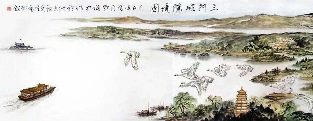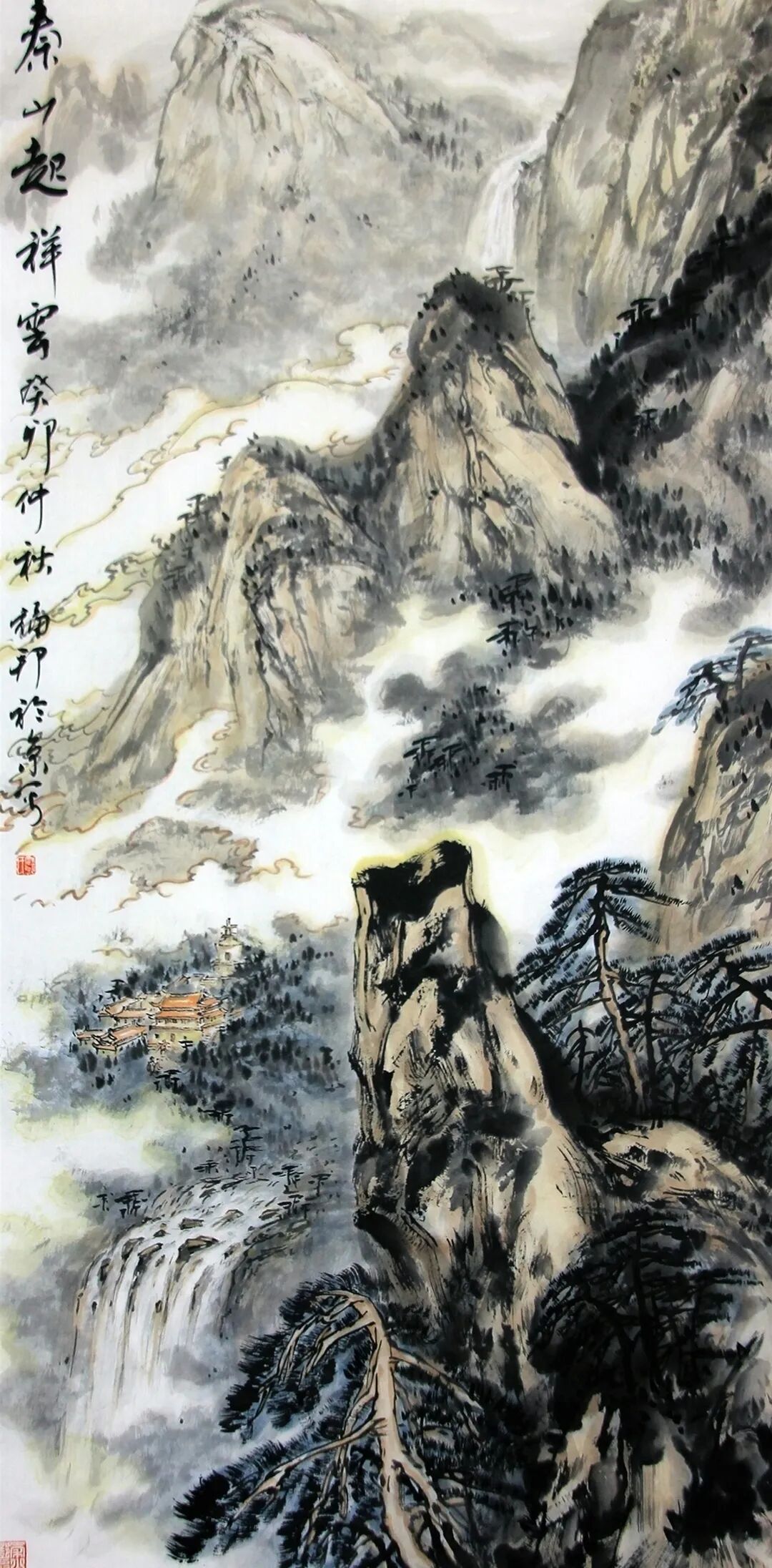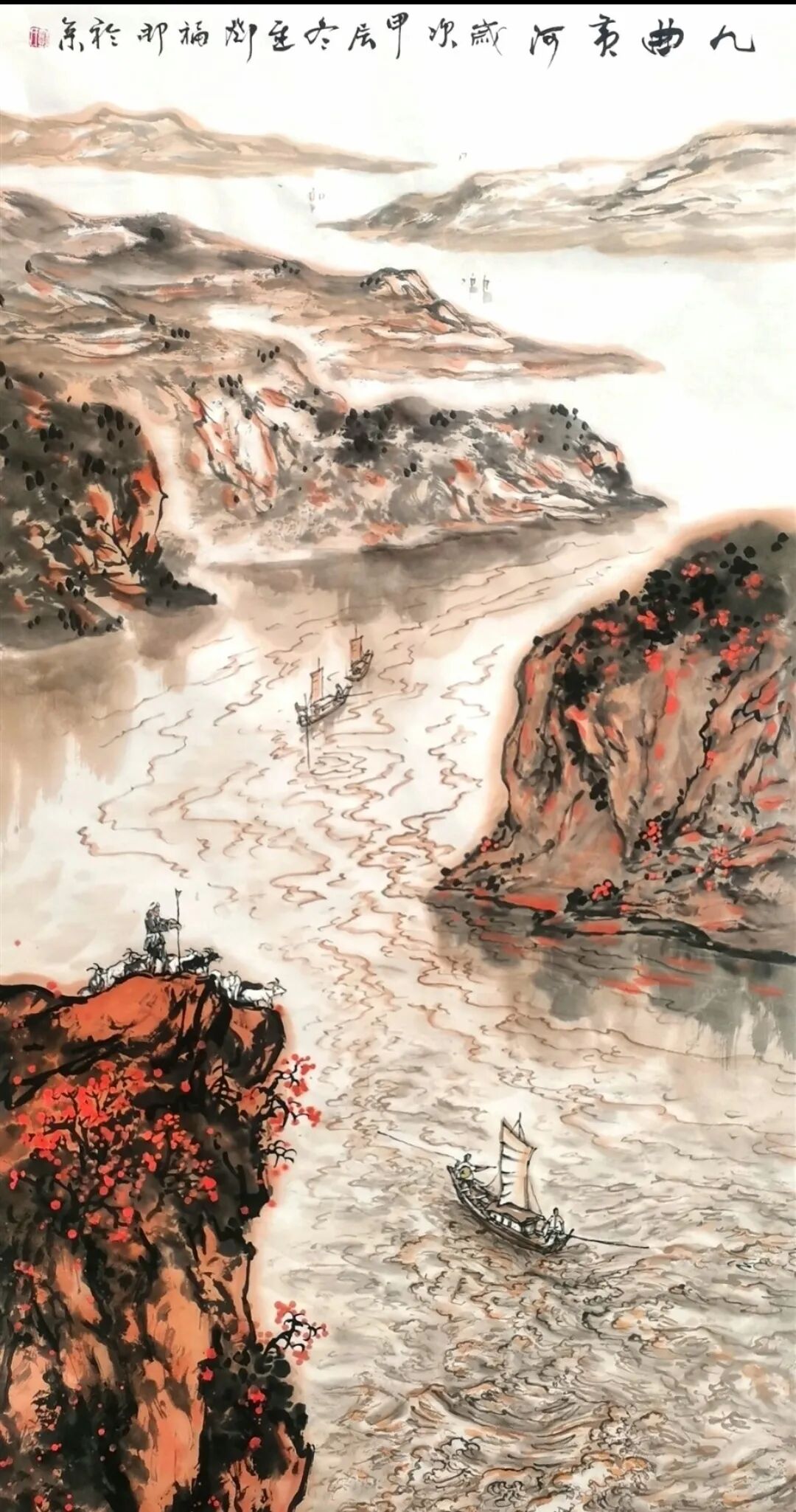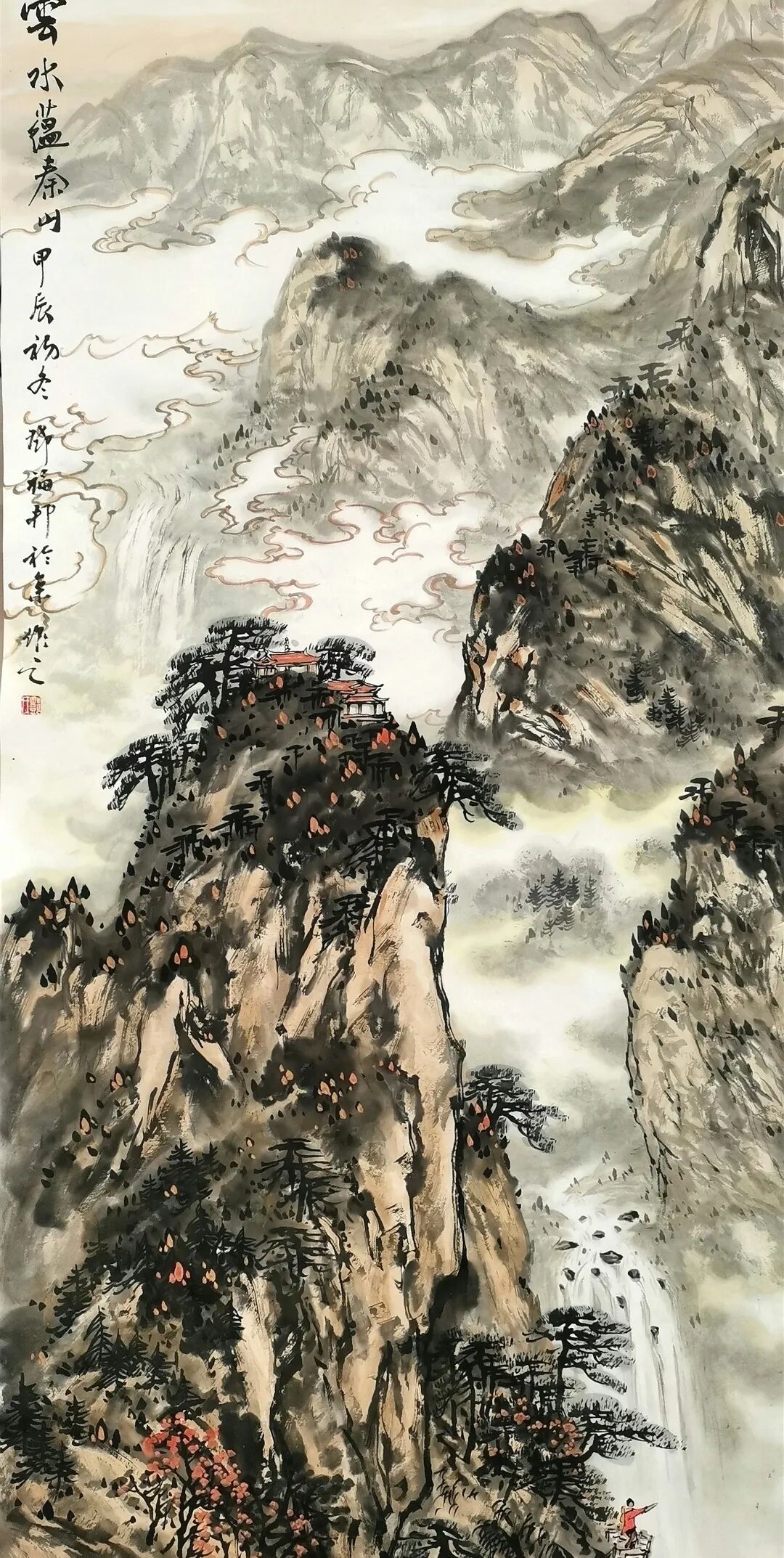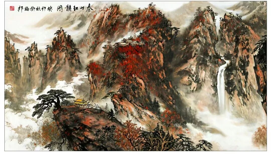 通过分析其作品,我们可以窥见其艺术世界的丰富性与深刻性。传统山水的当代诠释邓福邦的山水画作深深植根于中国绘画传统,却又展现出鲜明的个人风格。例如《秦山红韵图》等山水作品,展现了他对传统山水画的深刻理解与创新表达。以全景式构图呈现山峦连绵之势,色彩的巧妙运用创造出丰富的层次感,既具壮阔气象又不乏生活气息。体现出对山河文化的深刻理解。《秦山红韵图》以棕褐、墨色为主调,点缀鲜艳红色,营造出秋日的浓郁氛围。苍松、建筑、瀑布等元素的安排既符合传统山水画的构图法则,又通过色彩对比和光影处理赋予画面现代审美趣味。这种对传统山水语言的当代转化,正是邓福邦“道化丹青”理念的具体实践。现代性题材的传统表达邓福邦艺术创作的突出特点在于他成功地将现代题材融入传统书画语言,创造出一种既熟悉又新颖的视觉体验。